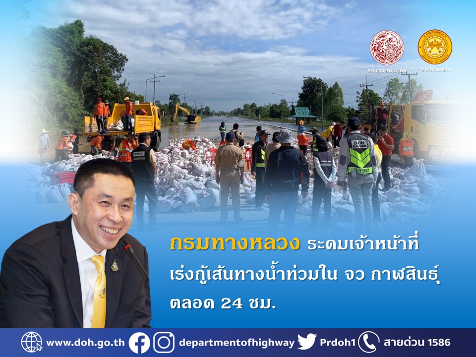 กรมทางหลวงระดมเจ้าหน้าที่เร่งกู้เส้นทางนำ้ท่วมใน จว. กาฬสินธุ์ ตลอด 24 ชม.