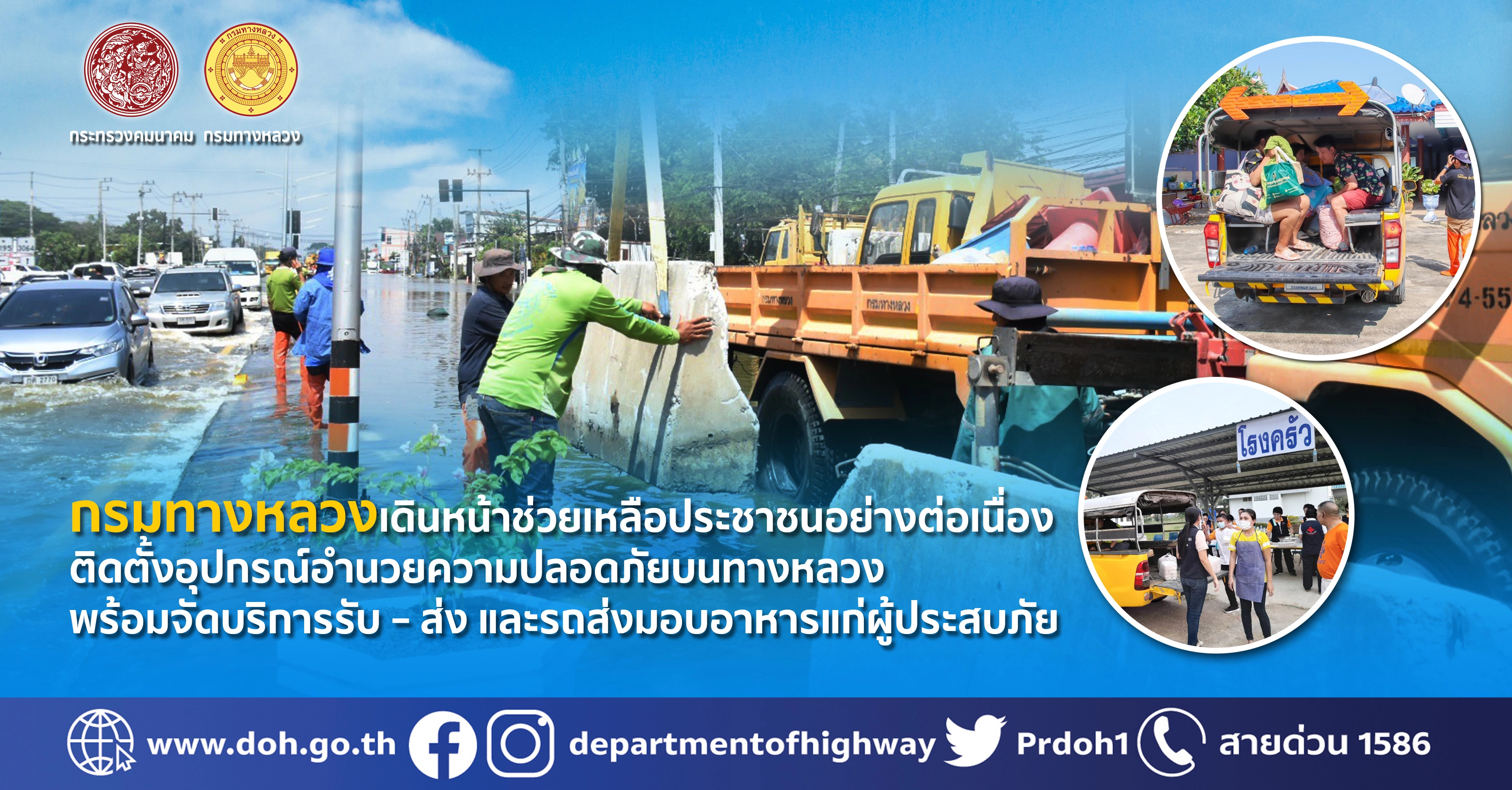 กรมทางหลวงเดินหน้าช่วยเหลือประชาชนอย่างต่อเนื่อง เร่งติดตั้งอุปกรณ์อำนวยความปลอดภัยบนทางหลวง พร้อมจัดบริการรับ – ส่ง และรถส่งมอบอาหารแก่ผู้ประสบภัย