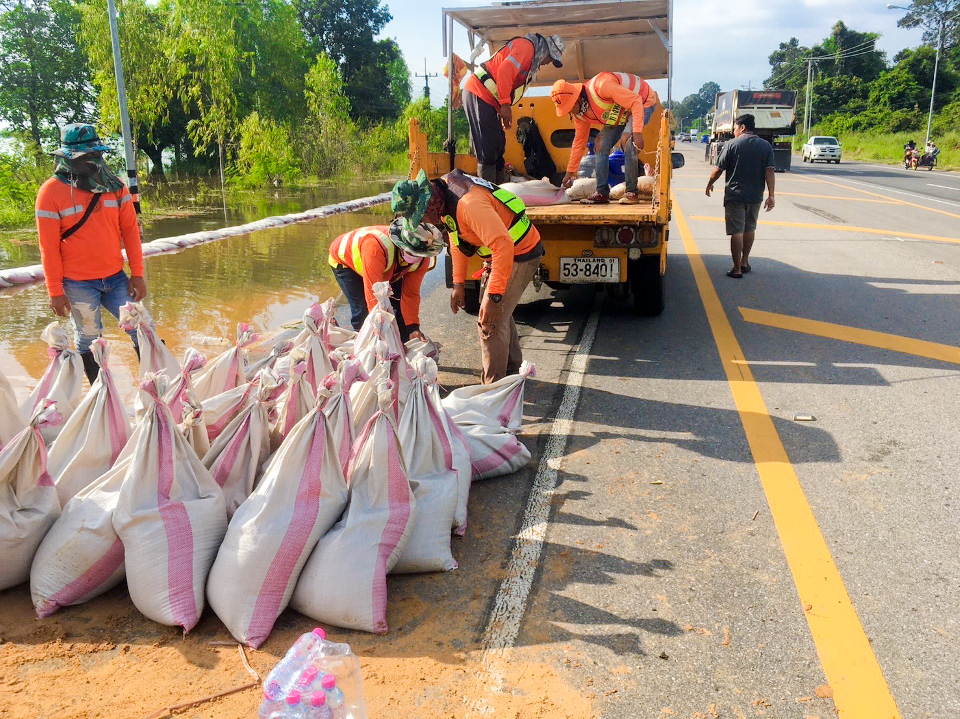 อุบลฯ, ศรีสะเกษ ยังอ่วม กรมทางหลวงเฝ้าระวังและติดตามสถานการณ์น้ำท่วมทางหลวง 24 ชม. พร้อมจัดทำโรงครัวเพื่อจิตอาสากรอกกระสอบทรายเสริมแนวป้องกันน้ำท่วม