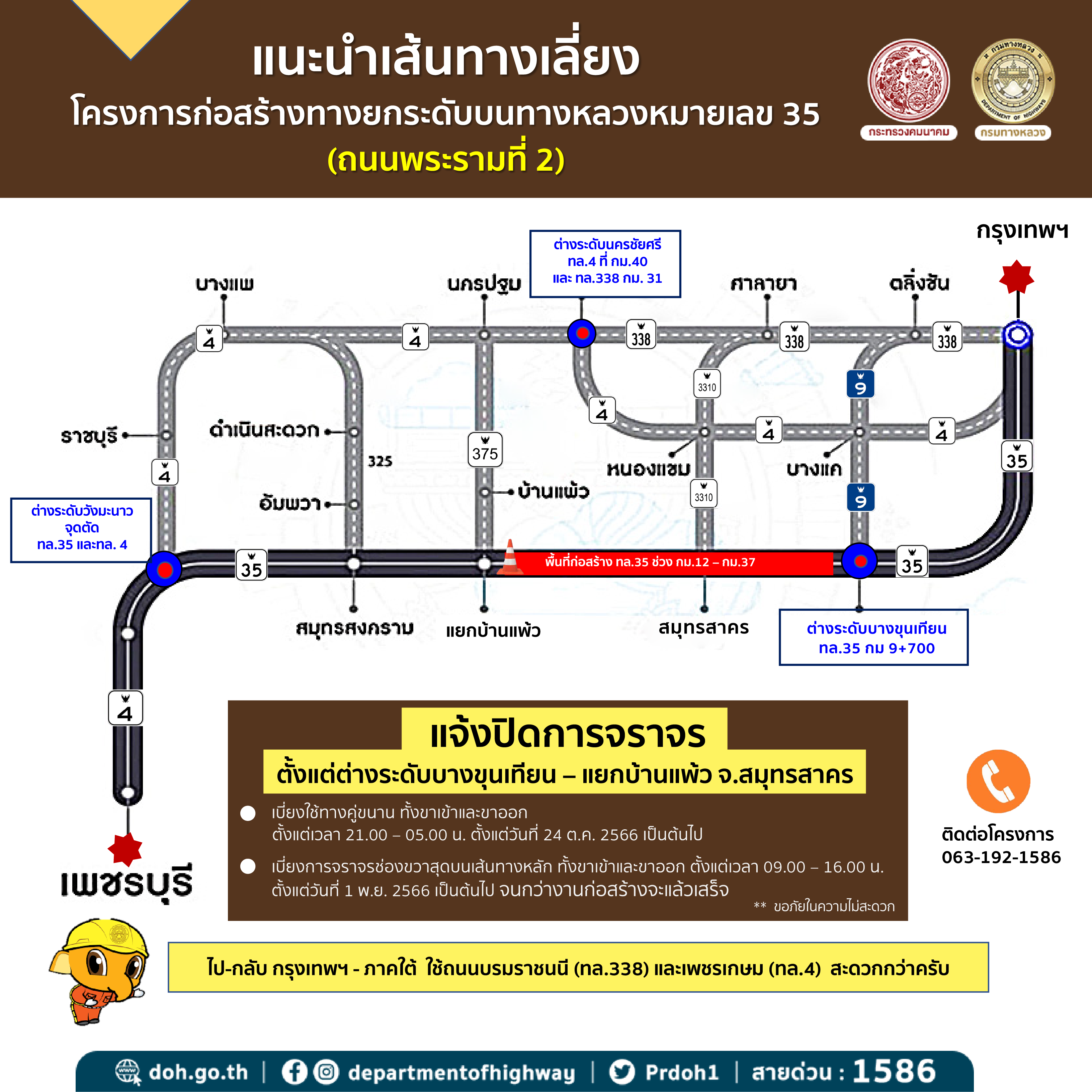 กรมทางหลวง แนะนำทางเลี่ยงถนนพระรามที่2 เพื่อก่อสร้างทางยกระดับ