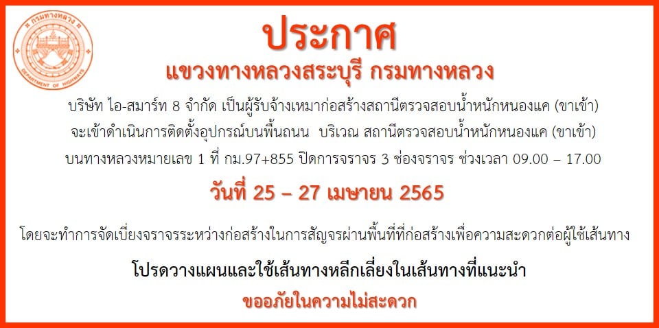 บริษัท ไอ-สมาร์ท 8 จำกัด เป็นผู้รับจ้างเหมาก่อสร้างสถานีตรวจสอบน้ำหนักหนองแค (ขาเข้า) จะเข้าดำเนินการติดตั้งอุปกรณ์บนพื้นถนน บริเวณ สถานีตรวจสอบน้ำหนักหนองแค (ขาเข้า) บนทางหลวงหมายเลข 1 ที่ กม.97+855 ปิดการจราจร 3 ช่องจราจร ช่วงเวลา 09.00 – 17.00