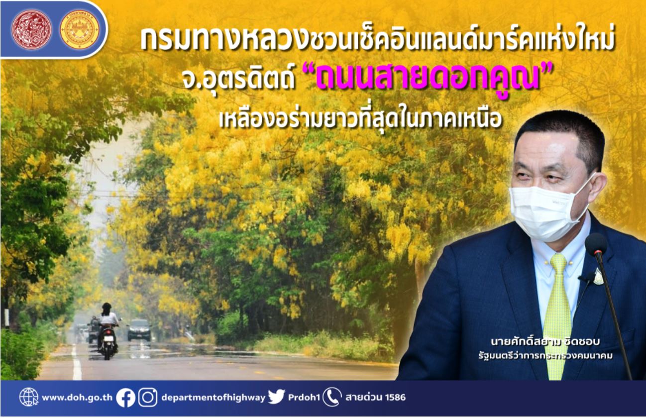 กรมทางหลวง โดย แขวงทางหลวงอุตรดิตถ์ที่ 1 เชิญชวนผู้ใช้ทางชมความสวยงามของถนนสายดอกคูณ จังหวัดอุตรดิตถ์ ที่บานพร้อมกันในช่วงฤดูร้อนของทุกปี เป็นแนวยาวที่สุดในภาคเหนือ ซึ่งจะออกดอกให้ชื่นชมปีละครั้งเท่านั้น พร้อมทั้งดำเนินการเตรียมความพร้อมปรับปรุงทางหลวงให้สวยงาม  ตามนโยบาย “คมนาคมสีสัน สร้างสรรค์ประเทศไทย” ของนายศักดิ์สยาม ชิดชอบ รัฐมนตรีว่าการกระทรวงคมนาคม ที่ได้สั่งการให้กรมทางหลวงเตรียมความพร้อมในทุกด้าน โดยเฉพาะเรื่องการอำนวยความสะดวกในการเดินทาง และปรับปรุงทัศนียภาพทางหลวง ให้มีความสวยงาม