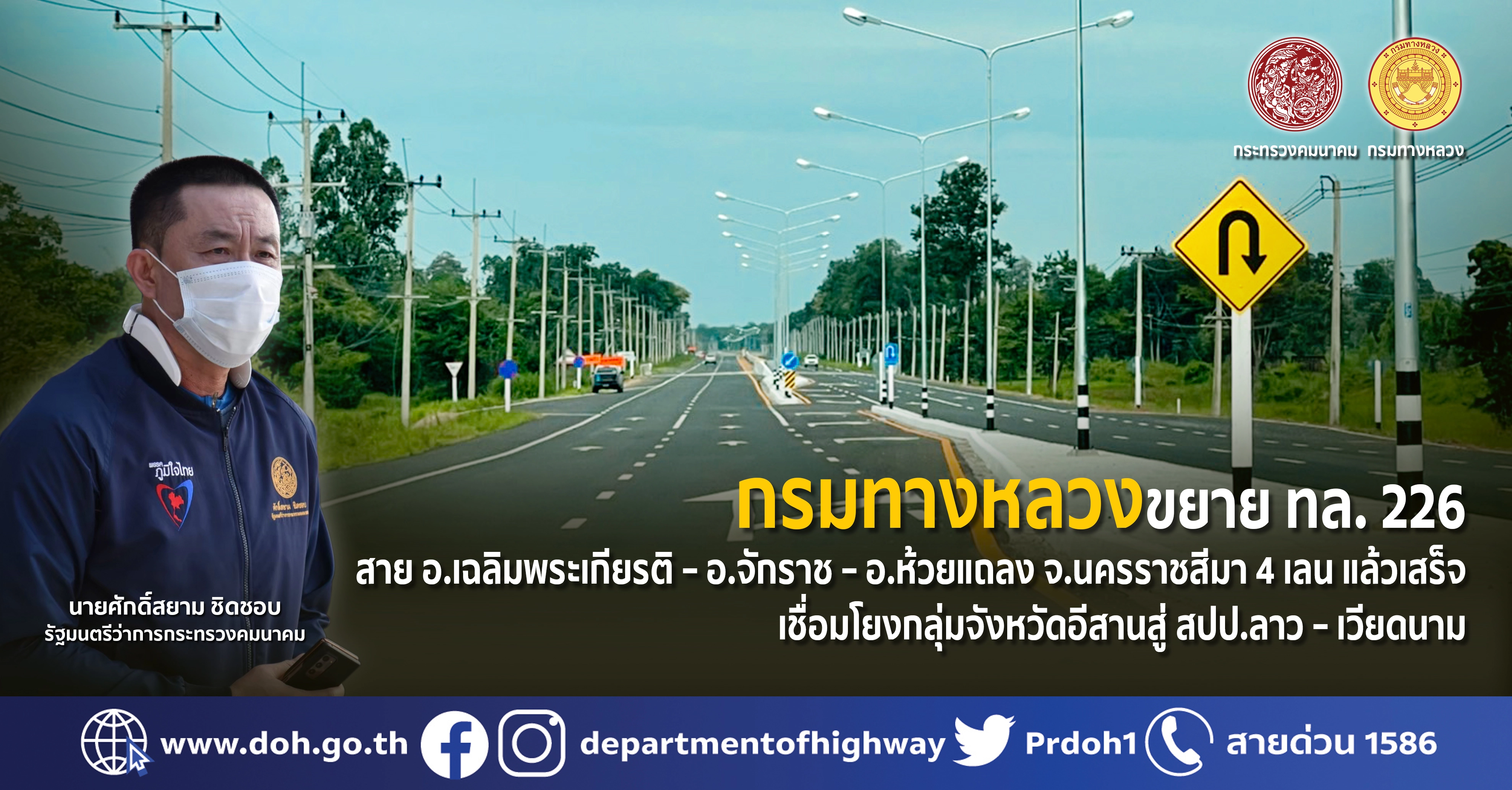 นายสราวุธ  ทรงศิวิไล  อธิบดีกรมทางหลวง เปิดเผยว่า กรมทางหลวงได้ดำเนินโครงการก่อสร้างขยายทางหลวงหมายเลข 226 สาย อ.เฉลิมพระเกียรติ – อ.จักราช – อ.ห้วยแถลง จ.นครราชสีมา จากขนาด 2 ช่องจราจร เป็นขนาด 4 ช่องจราจร แล้วเสร็จ ระยะทางประมาณ 21.660 กิโลเมตร ตามนโยบายของนายศักด์สยาม  ชิดชอบ รัฐมนตรีว่าการกระทรวงคมนาคม ที่ต้องการบูรณาการด้านคมนาคมและระบบโลจิสติกส์ รองรับเชื่อมโยงกลุ่มจังหวัดภาคตะวันออกเฉียงเหนือ กับ สปป.ลาว ต่อเนื่องไปยังประเทศเวียดนาม สนับสนุนส่งเสริมการค้า การลงทุน และเพิ่มศักยภาพการแข่งขันของประเทศ อีกทั้งเพื่อแก้ไขปัญหาจราจร ลดอุบัติเหตุ และลดต้นทุนในการขนส่งสินค้า เพิ่มความสามารถในการแข่งขันด้านการค้า