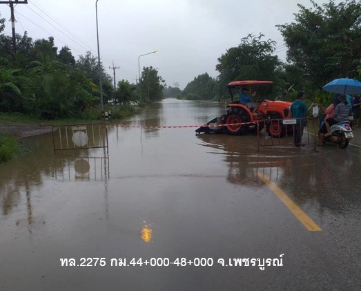 5. จังหวัดเพชรบูรณ์ ทางหลวงหมายเลข 2216 โคกมน – กกกะทอน อ.หล่มเก่า ช่วง กม.ที่ 85+650 สะพานห้วยน้ำย่า (สะพานชั่วคราว) ได้รับความเสียหายจากน้ำท่วม การจราจรผ่านไม่ได้ แนะนำใช้ทางเลี่ยงสาย ทช.2012 บ้านตาดกลอย – บ้านหนองยาว มีเจ้าหน้าที่คอยอำนวยความสะดวกด้านการจราจร อยู่ระหว่างเข้าดำเนินการตรวจสอบ