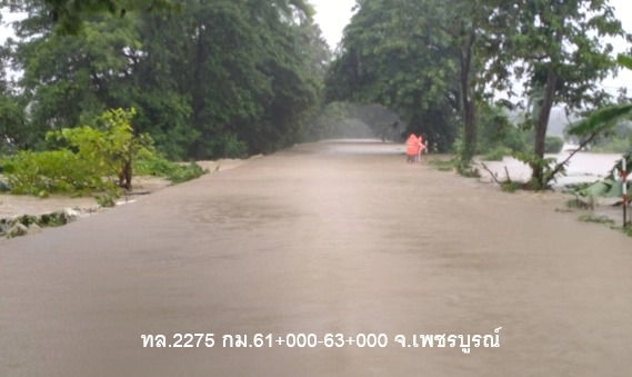 8. จังหวัดเพชรบูรณ์ ทางหลวงหมายเลข 2275 แยกศรีเทพ – ซับบอน อ.วิเชียรบุรี ช่วง กม.ที่ 61+000 – 63+000 ระดับน้ำ 60 ซม. การจราจรไม่สามารถผ่านได้