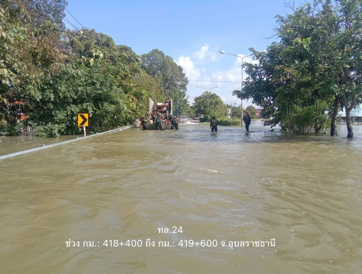 - ทางหลวงหมายเลข 24 วารินชำราบ – อุบลราชธานี ในพื้นที่ อ.วารินชำราบ ช่วง กม.ที่ 418+400 – 419+600 ระดับน้ำ 115 ซม. แนะนำเส้นทางเลี่ยง ทล.217 ทางแยกต่างระดับบัวเทิง เลี้ยวซ้ายไปสะพานข้ามแม่น้ำมูล เข้าสู่ตัวเมืองอุบลราชธานี
