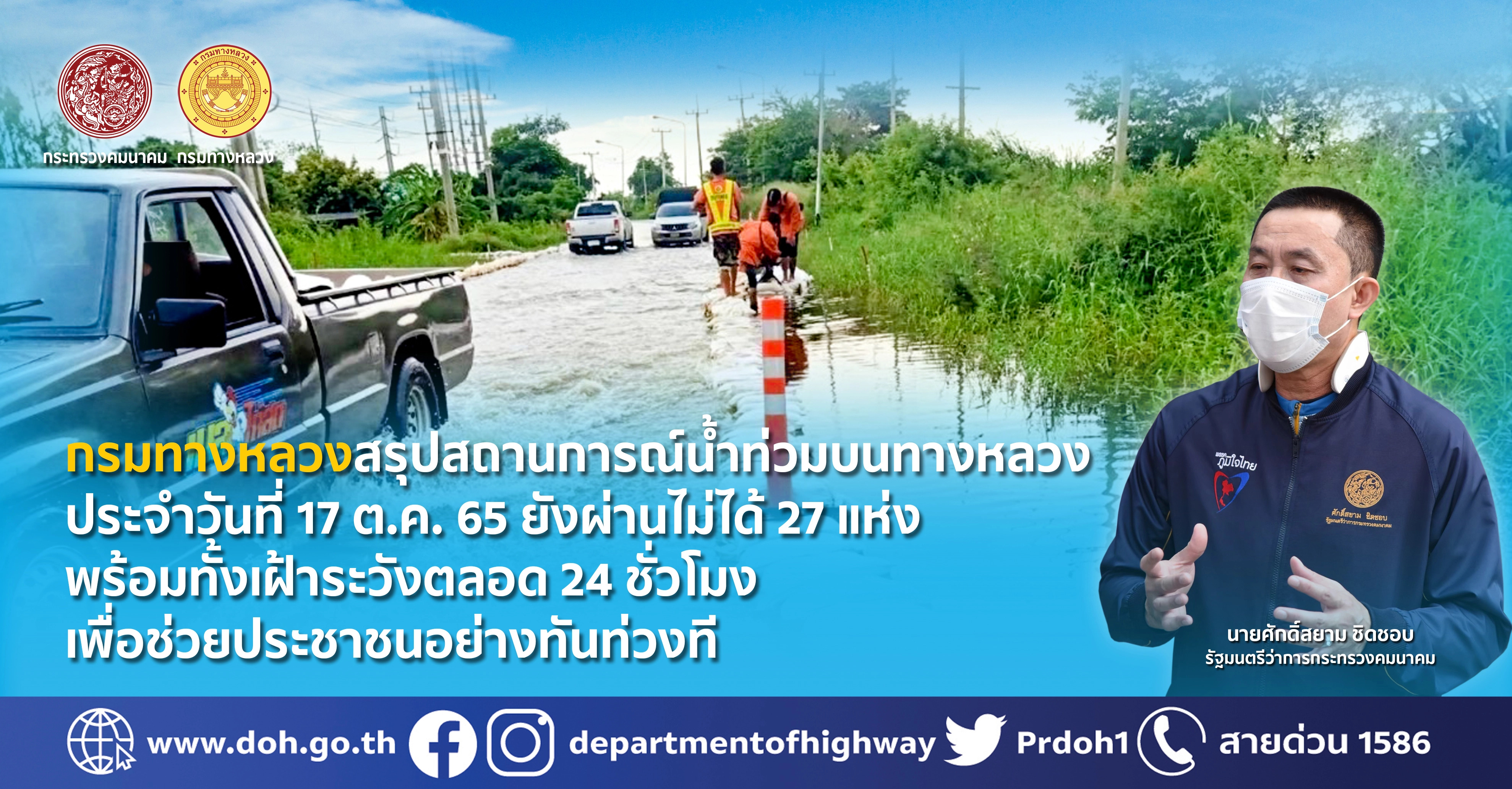 กรมทางหลวงสรุปสถานการณ์น้ำท่วมบนทางหลวง ประจำวันที่ 17 ต.ค. 65 ยังผ่านไม่ได้ 27 แห่ง พร้อมทั้งเฝ้าระวังตลอด 24 ชั่วโมง เพื่อช่วยประชาชนอย่างทันท่วงที