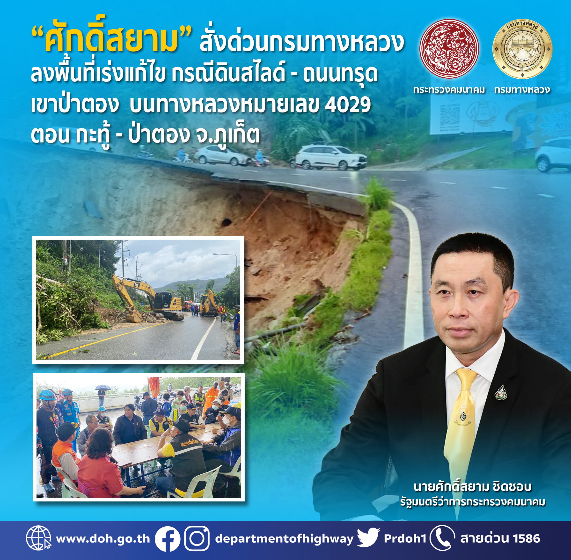 “ศักดิ์สยาม” สั่งด่วนกรมทางหลวง ลงพื้นที่เร่งแก้ไขกรณีดินสไลด์ - ถนนทรุด เขาป่าตอง บนทางหลวงหมายเลข 4029 ตอน กะทู้ - ป่าตอง จ.ภูเก็ต