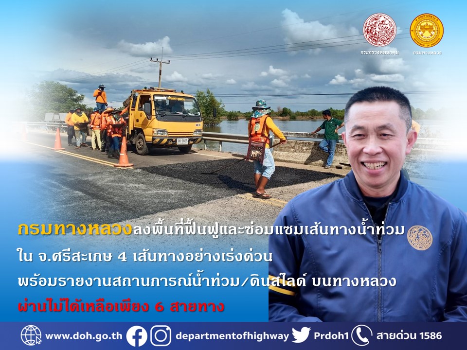 นายสราวุธ  ทรงศิวิไล อธิบดีกรมทางหลวง เปิดเผยว่า จากสถานการณ์น้ำท่วมบนทางหลวงในหลายจังหวัด ส่งผลกระทบให้ประชาชนในพื้นที่และรอบๆ ได้รับความเดือดร้อน ซึ่งที่ผ่านมากรมทางหลวงได้ให้ความช่วยเหลือทั้งกรณีเร่งด่วนและต่อเนื่องตามสถานการณ์ โดยดำเนินการตามนโยบาย นายศักดิ์สยาม  ชิดชอบ  รัฐมนตรีว่าการกระทรวงคมนาคม ที่ให้ความสำคัญในการช่วยเหลือผู้ประสบอุทกภัย พร้อมแสดงความห่วงใยและส่งกำลังใจถึงประชาชนในพื้นที่ให้สามารถผ่านวิกฤตการณ์ดังกล่าวไปได้โดยเร็ว  โดยในวันที่ 28 ตุลาคม 2565 แขวงทางหลวงศรีสะเกษที่ 1 ได้ดำเนินการฟื้นฟูและซ่อมแซมเส้นทางที่ได้รับความเสียหายจากภัยพิบัติ ทำการปะซ่อมผิวทางให้ประชาชนกลับมาสัญจรได้อย่างปกติ จำนวน 4 เส้นทาง ได้แก่