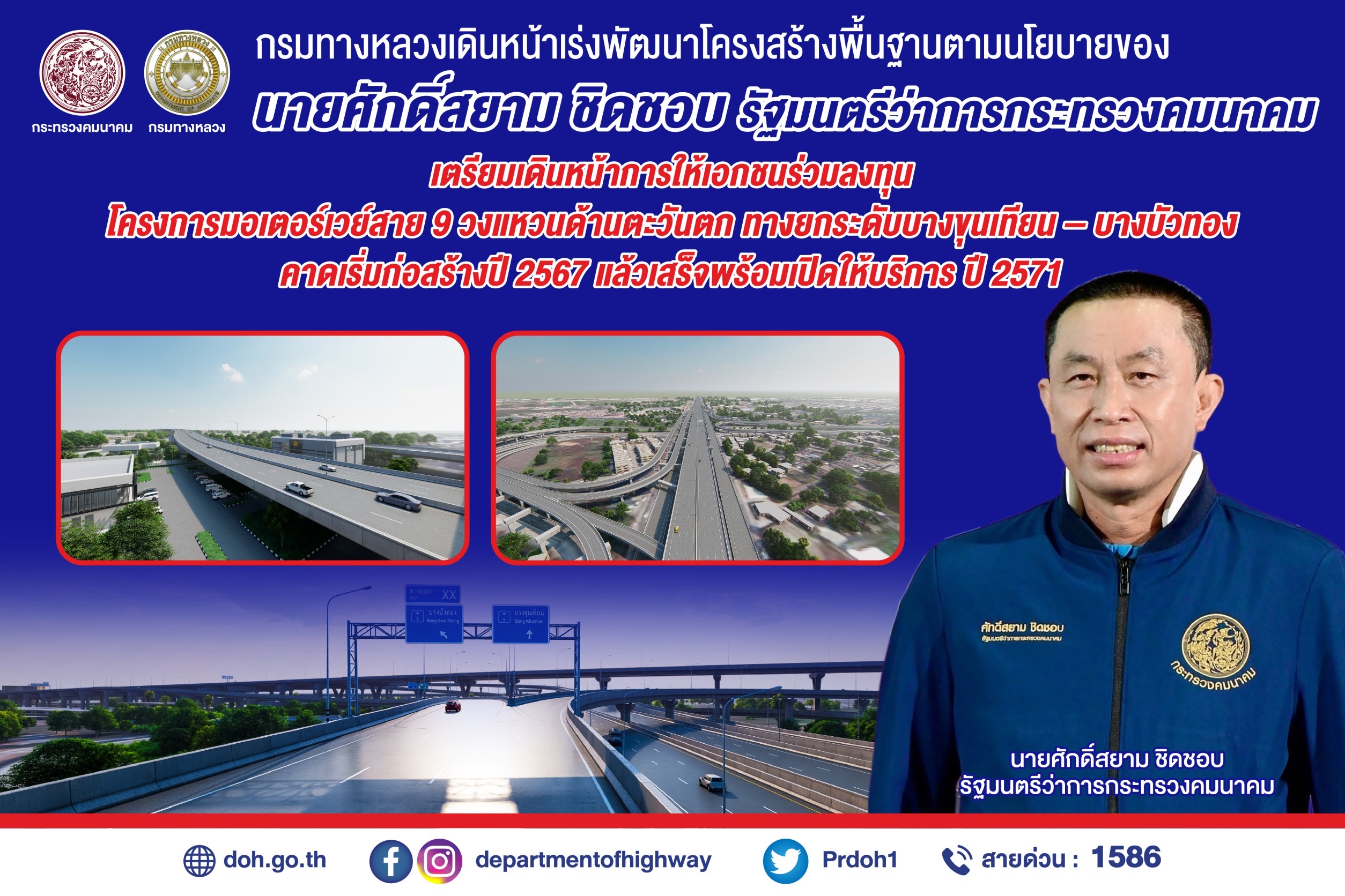 กรมทางหลวงเตรียมเดินหน้าการให้เอกชนร่วมลงทุนโครงการมอเตอร์เวย์สาย 9 วงแหวนด้านตะวันตก ทางยกระดับบางขุนเทียน – บางบัวทอง หลังบอร์ด PPP ไฟเขียว