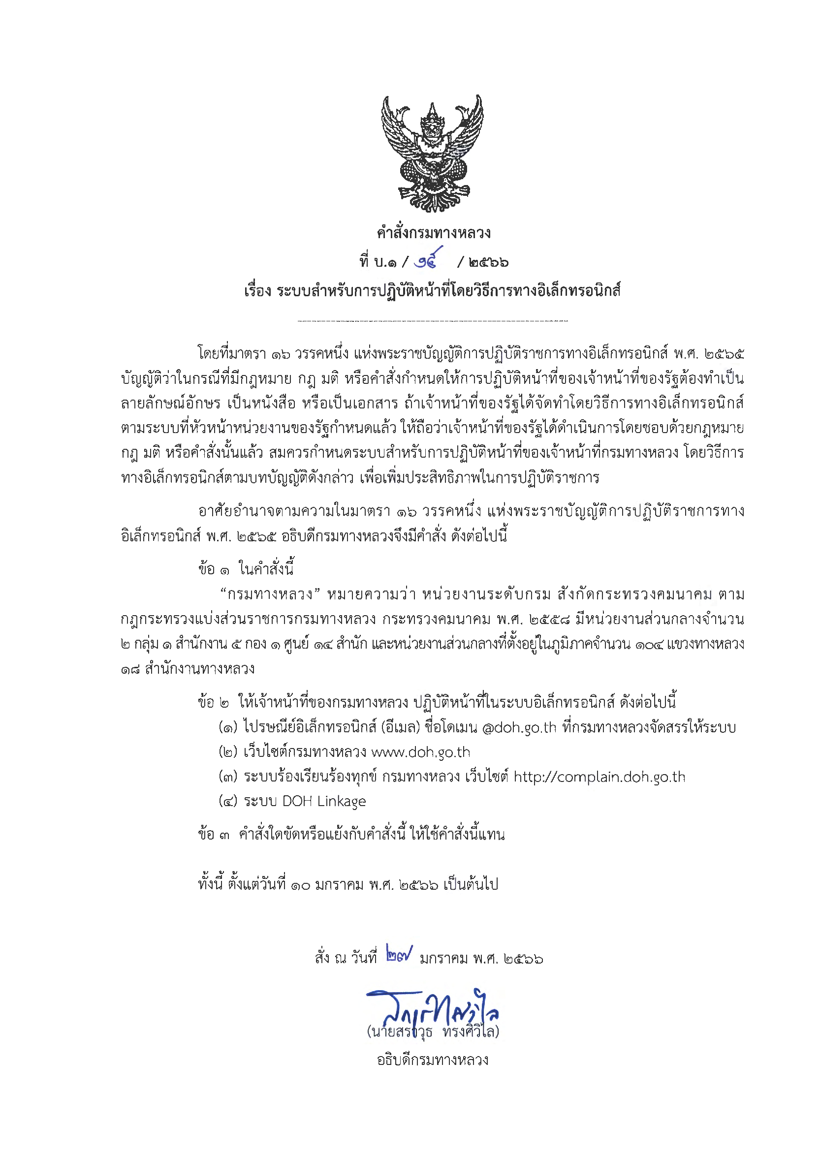 คำสั่ง บ.1-19-2566 เรื่อง ระบบสำหรับการปฏิบัติหน้าที่โดยวิธีอิเล็กทรอนิกส์