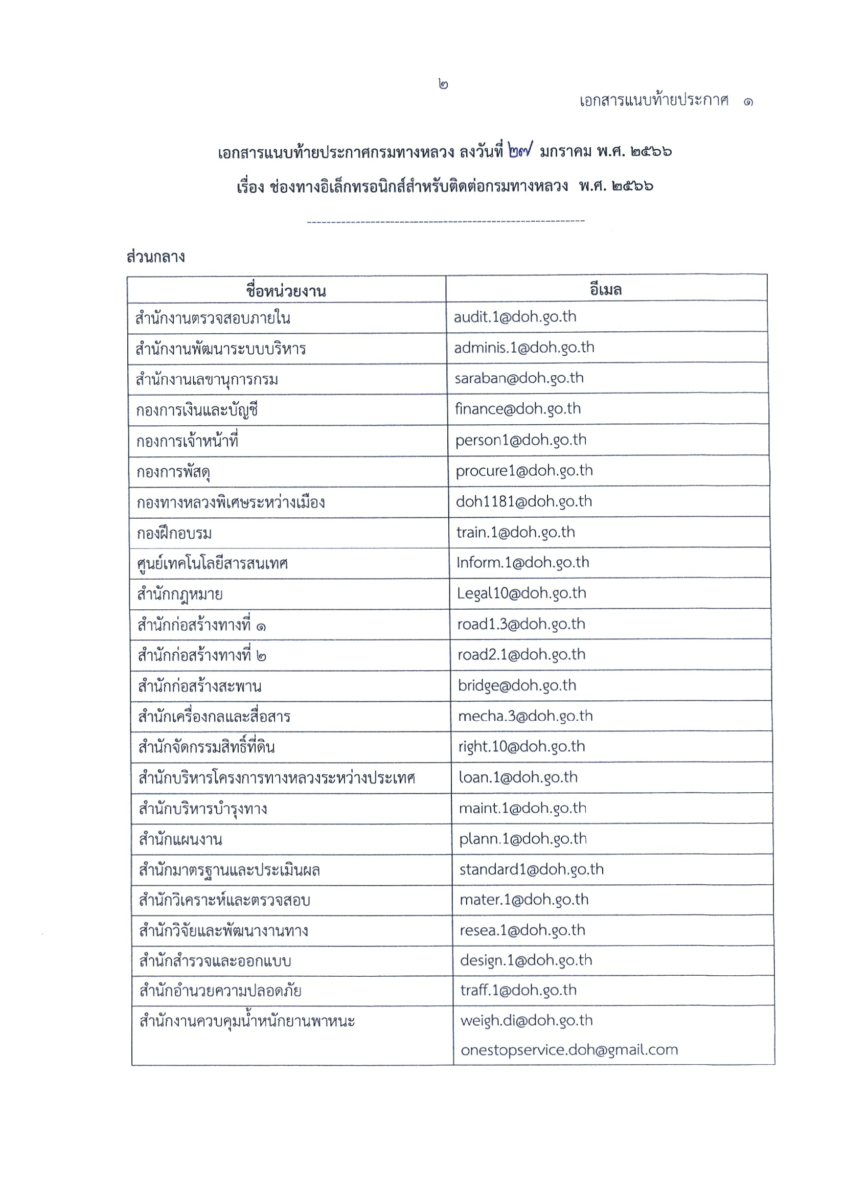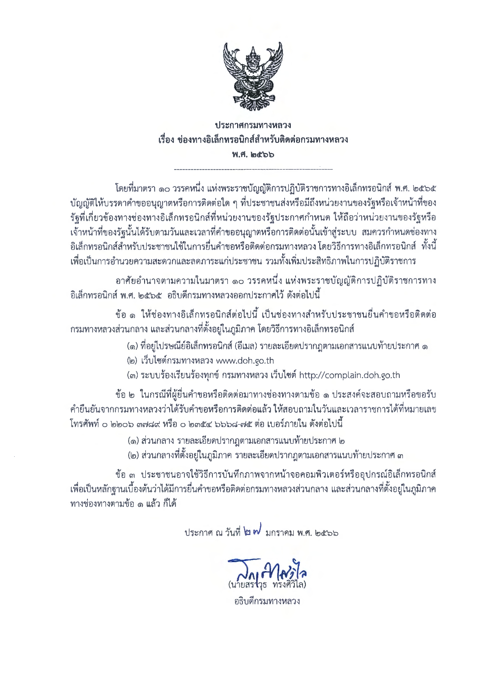ประกาศกรมทางหลวง เรื่อง ช่องทางอิเล็กทรอนิกส์ สำหรับติดต่อกรมทาง พ.ศ.2566