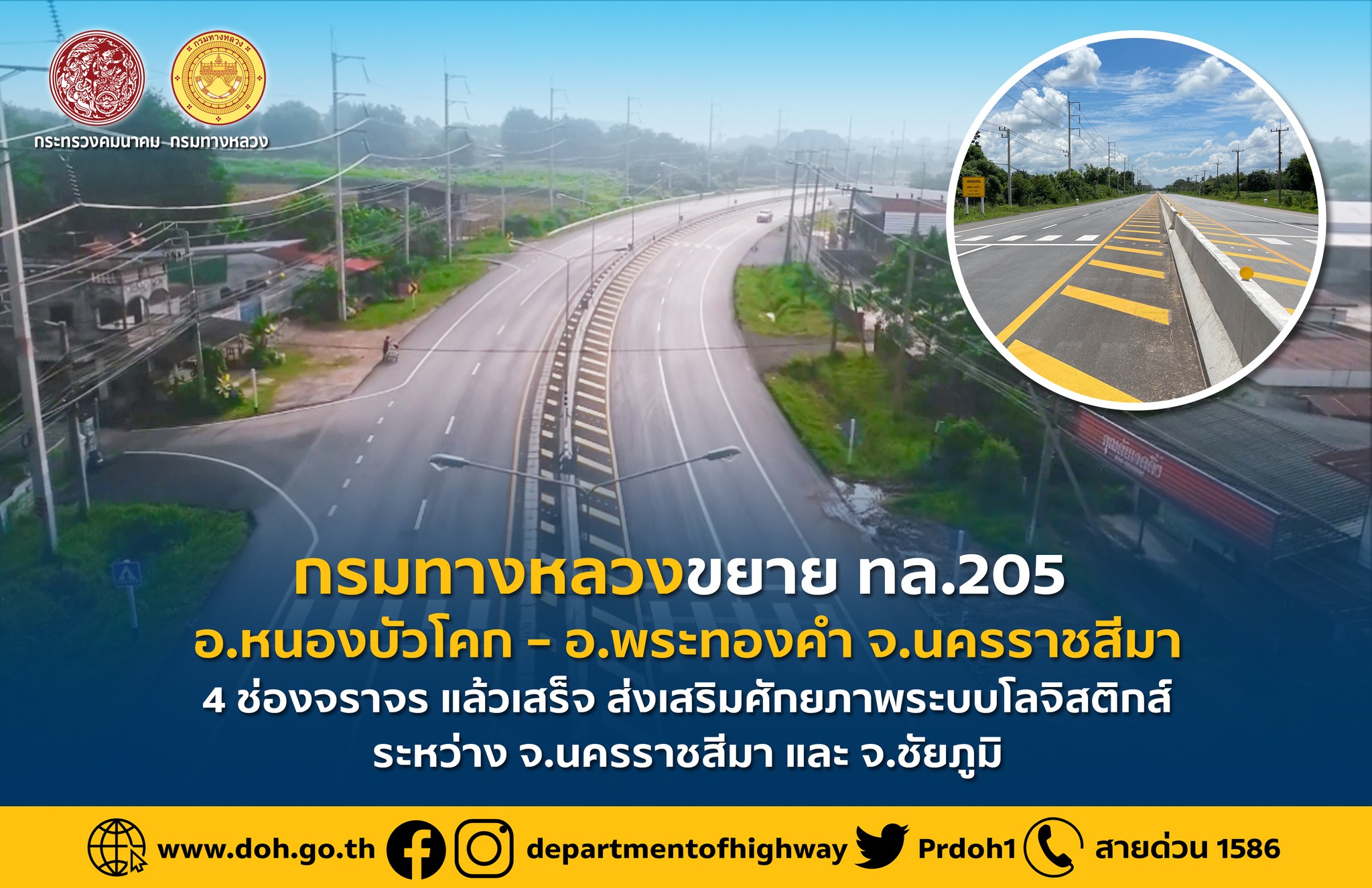 ทางหลวงหมายเลข 205 สาย อ.หนองบัวโคก – อ.พระทองคำ ปัจจุบันการจราจรหนาแน่น มีปริมาณการจราจรเฉลี่ย 7,972 คันต่อวัน มีปริมาณรถบรรทุกร้อยละ 28.99 เป็นทางหลวงขนาด 2 ช่องจราจรสวนทางกันและมีผิวจราจรที่แคบ เสี่ยงต่อการเกิดอุบัติเหตุ จึงมีความจำเป็นต้องมีการปรับปรุงขยายทางหลวงช่วงดังกล่าวให้เป็นขนาด 4 ช่องจราจร โดยโครงการดังกล่าวก่อสร้างเป็นเกรด AC 40 – 50 เพื่อให้มีความสะดวกปลอดภัย อีกทั้งยังเป็นการปรับปรุงและเพิ่มความแข็งแรงของชั้นโครงสร้างทางให้ดีขึ้น มาตรฐานทางชั้นพิเศษ 4 ช่องจราจร (ไป – กลับ ข้างละ 2 ช่องจราจร) ผิวทางแบบแอสฟัลต์คอนกรีต กว้างช่องละ 3.50 เมตร ไหล่ทางด้านนอกกว้าง 2.50 เมตร แบ่งทิศทางการจราจรด้วยเกาะกลางแบบคอนกรีตแบริเออร์และแบบยก กว้าง 4.60 เมตร พร้อมติดตั้งไฟฟ้าแสงสว่างและอุปกรณ์อำนวยความปลอดภัย งบประมาณ 658.79 ล้านบาท