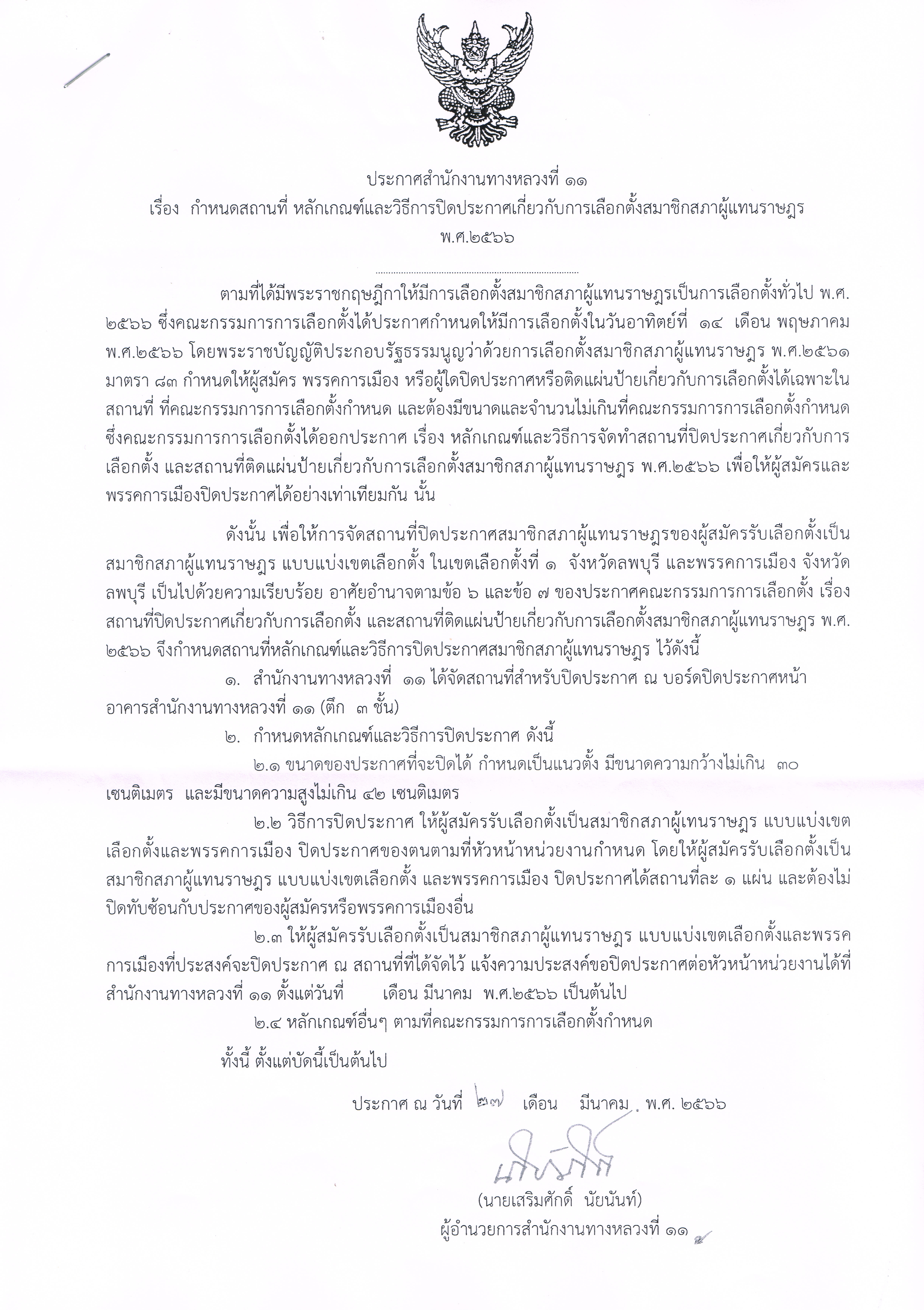 กำหนดสถานที่ หลักเกณฑ์และวิธีการปิดประกาศเกี่ยวกับการเลือกตั้งสมาชิกสภาผู้แทนราษฎร พ.ศ.2566