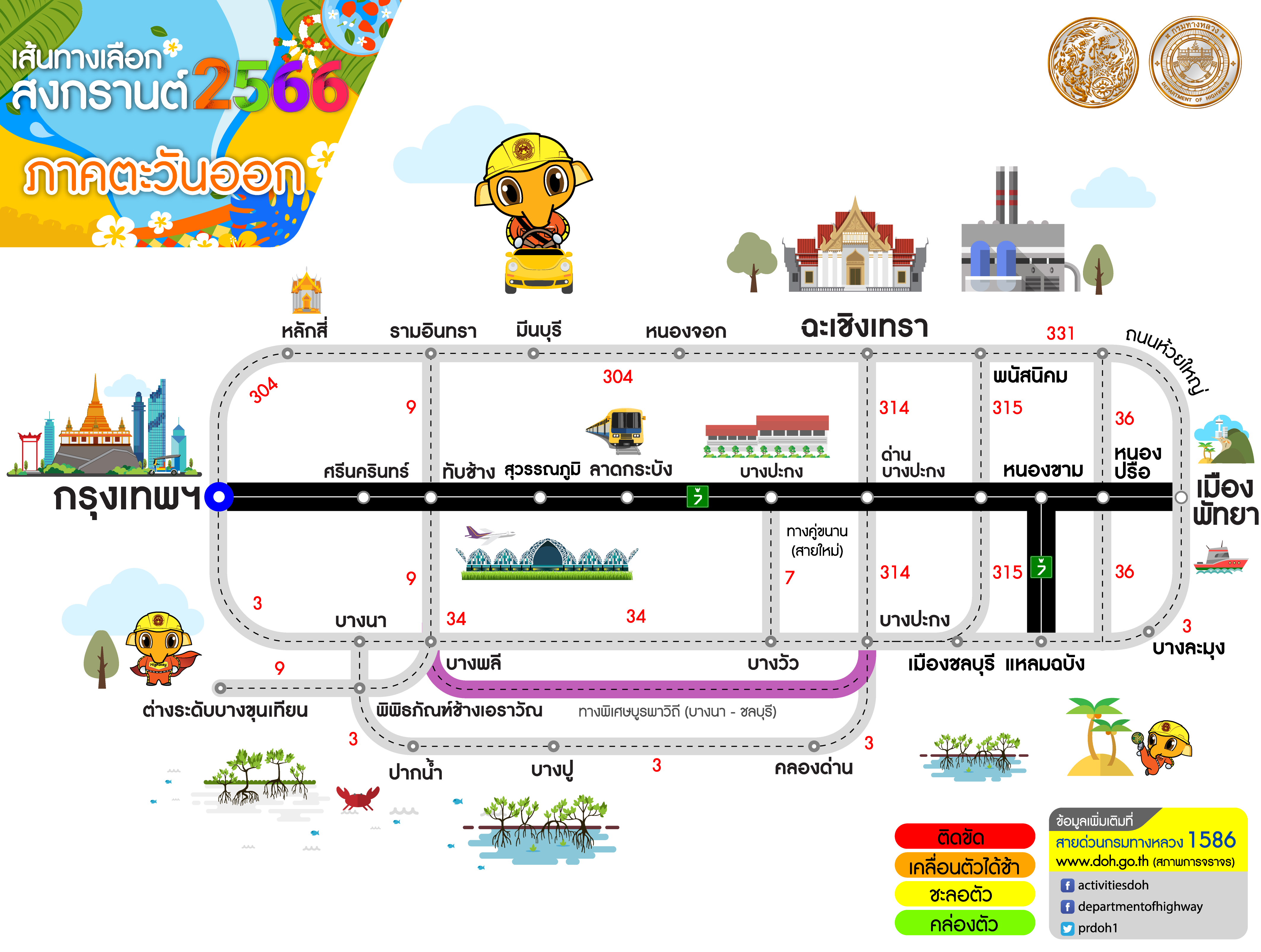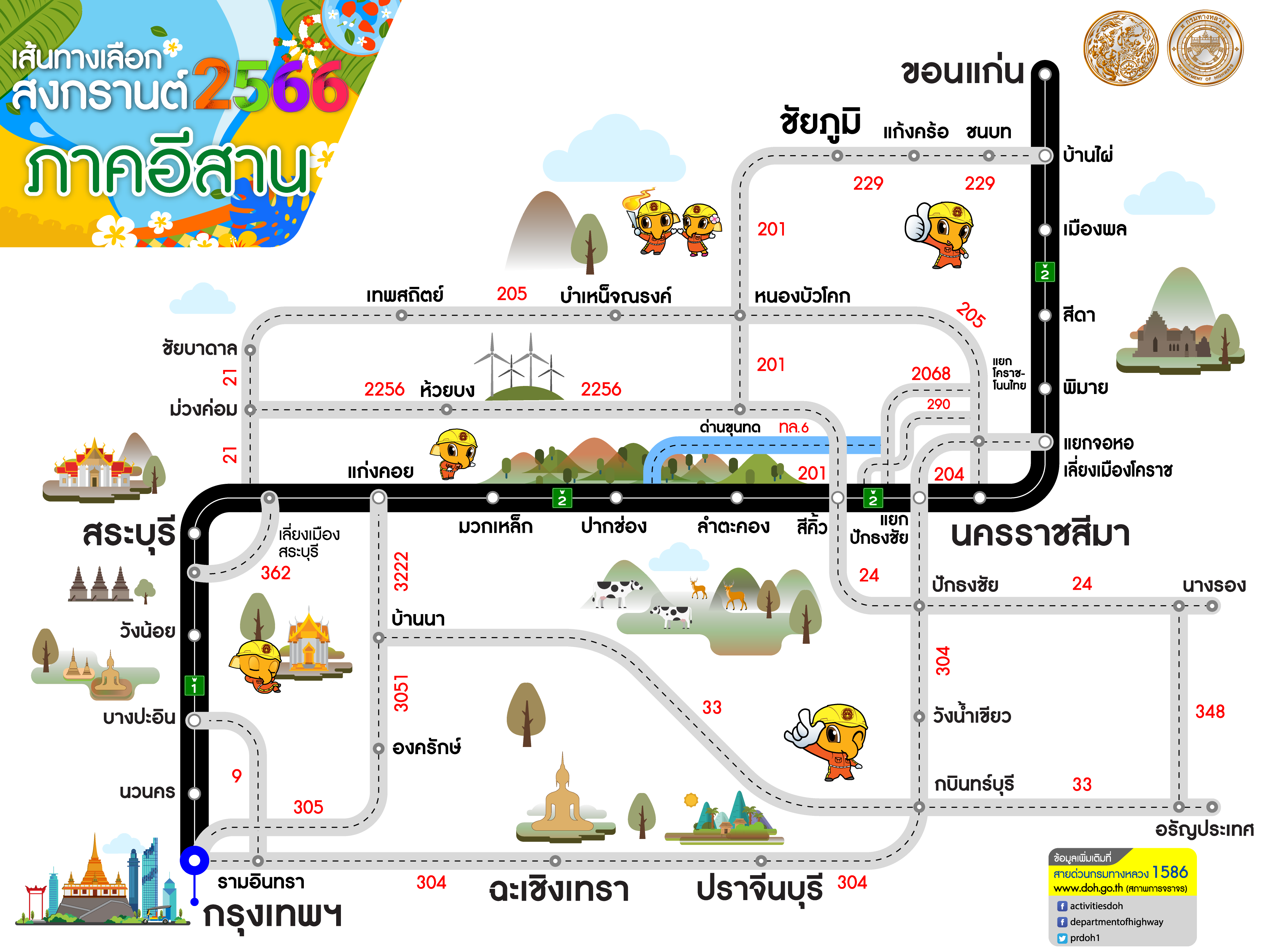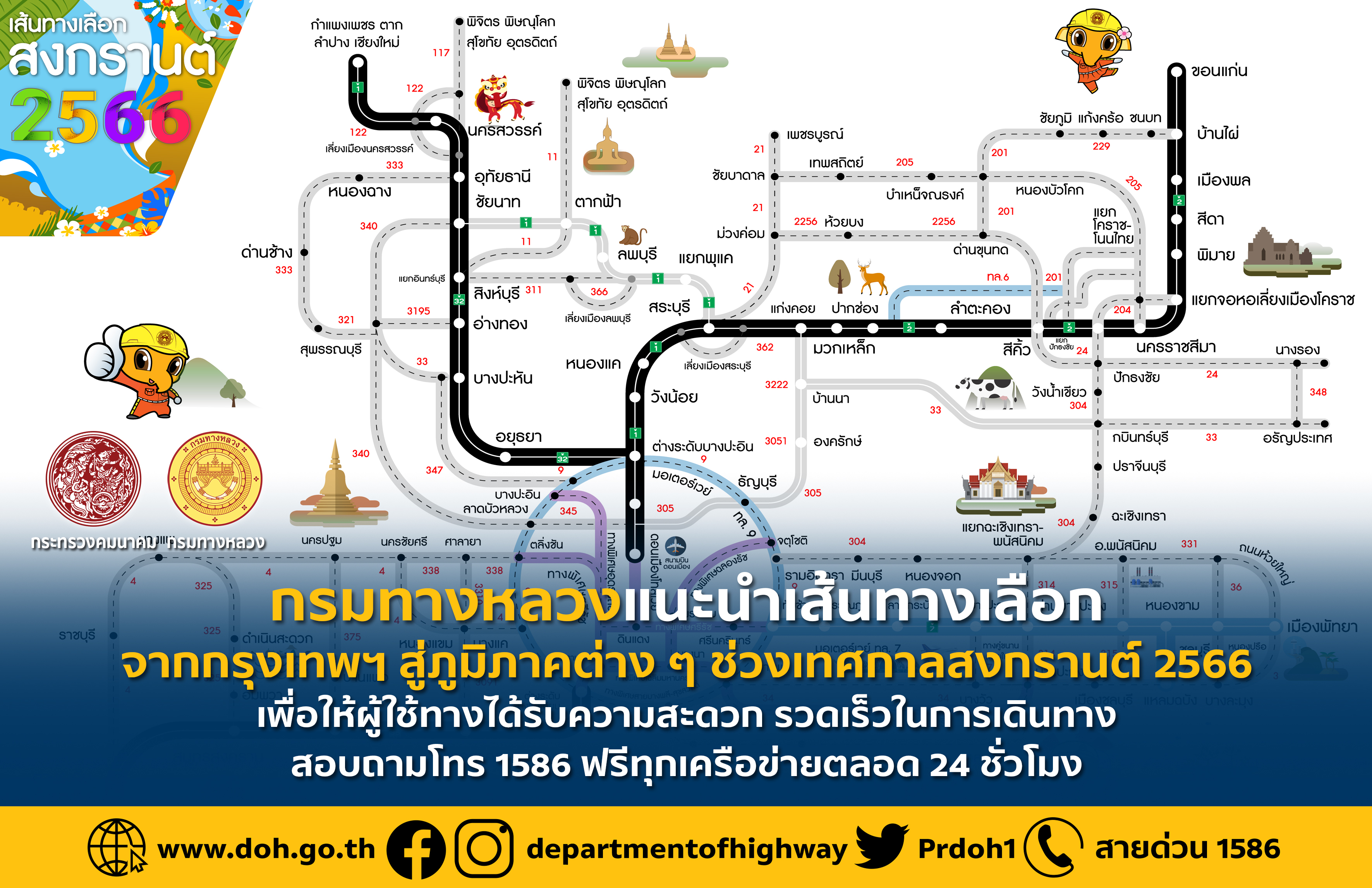กรมทางหลวงแนะนำเส้นทางเลือกจากกรุงเทพฯ สู่ภูมิภาคต่าง ๆ ช่วงเทศกาลสงกรานต์ 2566 เพื่อให้ผู้ใช้เส้นทางได้รับความสะดวก รวดเร็วในการเดินทาง สอบถามโทร 1586 ฟรีทุกเครือข่ายตลอด 24 ชั่วโมง