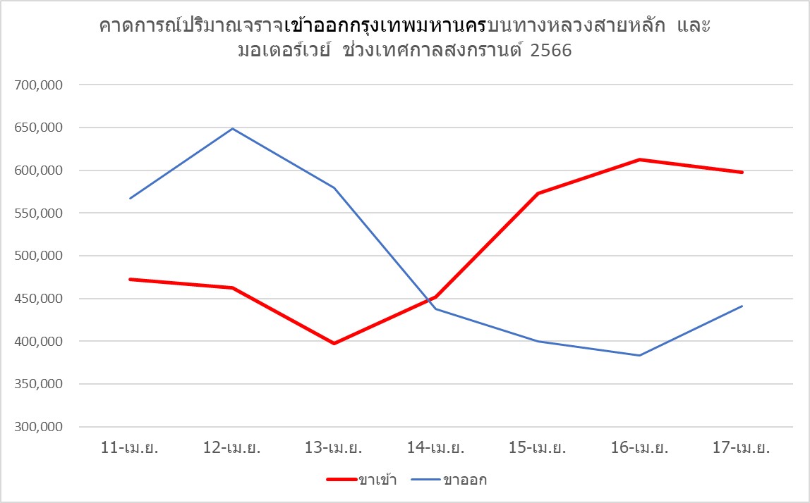 โดยสำนักอำนวยความปลอดภัย กรมทางหลวงได้คาดการณ์ปริมาณจราจรเข้าออกกรุงเทพมหานคร บนทางหลวงสายหลักและมอเตอร์เวย์ 10 เส้นทาง ในช่วงระหว่างวันที่ 11-17 เมษายน 2566 รวมทั้งสิ้น 7,026,157 คัน มากกว่าเทศกาลสงกรานต์ปี 2565 อยู่ 5.3% โดยแบ่งเป็นขาออก 3,458,690 คัน และขาเข้า 3,567,467 คัน โดยคาดว่าวันที่ 12 เมษายน 2566 จะมีปริมาณจราจรขาออกสูงสุดประมาณ 648,530 คัน และวันที่ 16 เมษายน 2566 จะมีปริมาณจราจรขาเข้ากรุงเทพมหานครสูงสุดประมาณ 612,769 คัน ทั้งนี้ เพื่อเป็นการอำนวยความสะดวกแก่ผู้เดินทางและหลีกเลี่ยงปัญหาการจราจรติดขัดในช่วงเทศกาลดังกล่าว กรมทางหลวงจึงได้แนะนำเส้นทางเลือกบนทางหลวงสายหลักและสายรอง เพื่อให้ประชาชนวางแผนการเดินทางล่วงหน้า โดยแบ่งเป็นภาคต่าง ๆ ดังนี้