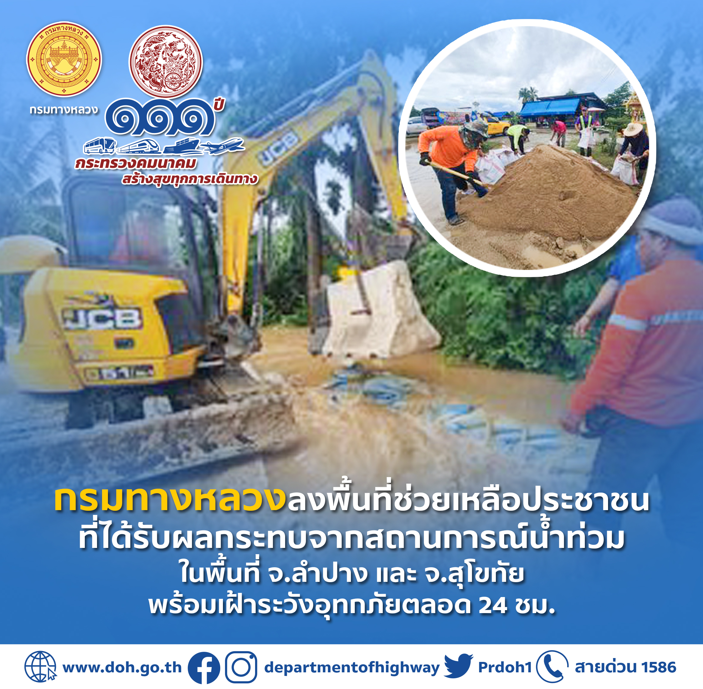 กรมทางหลวงลงพื้นที่ช่วยเหลือประชาชนที่ได้รับผลกระทบจากสถานการณ์น้ำท่วม ในพื้นที่ จ.ลำปาง และ จ.สุโขทัย พร้อมเฝ้าระวังอุทกภัยตลอด 24 ชม.