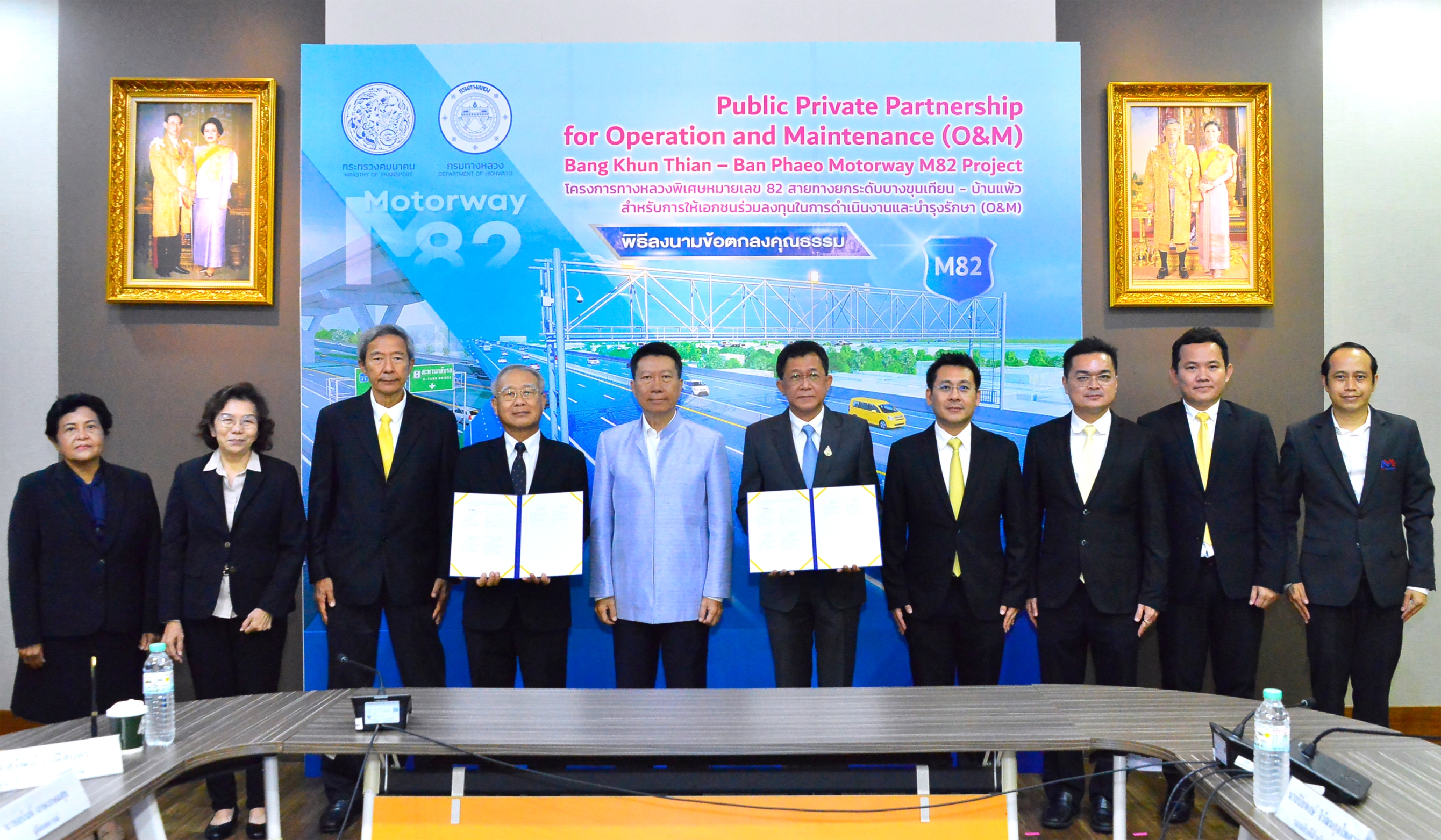 นายสราวุธ ทรงศิวิไล อธิบดีกรมทางหลวง ลงนามในข้อตกลงคุณธรรม (Integrity Pact : IP) โครงการทางหลวงพิเศษหมายเลข 82 สายทางยกระดับบางขุนเทียน-บ้านแพ้ว สำหรับการให้เอกชนร่วมลงทุนในการดำเนินงานและบำรุงรักษา (O&M) ร่วมกับผู้สังเกตการณ์ซึ่งเป็นผู้ทรงคุณวุฒิที่มีความรู้ความเชี่ยวชาญ มีประสบการณ์ที่จำเป็นต่อการคัดเลือกเอกชนของโครงการ จำนวน 4 ท่าน ประกอบด้วย ดร.สุวัฒน์ วาณีสุบุตร (ผู้นำทีม) นายอนันต์