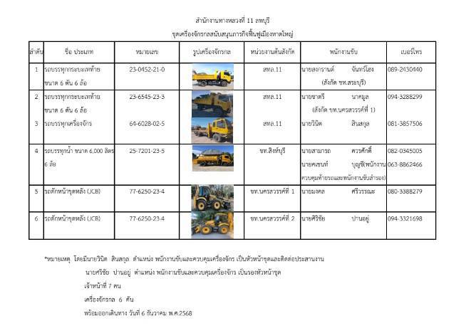 นายเอกนรินทร์ จินทะวงค์ ผู้อำนวยการสำนักงานทางหลวงที่ 11 ได้ส่งเครื่องจักร สทล.11 และแขวงทางหลวงในสังกัด จำนวน 6 คัน ประกอบด้วยรถบรรทุก6ล้อ 3 คัน รถบรรทุกน้ำ 1 คัน และรถตักหน้าขุดหลังJCB 2 คัน โดยมอบหมายให้ นายวินิต สินสกุล ตำแหน่ง พนักงานขับและควบคุมเครื่องจักร เจ้าหน้าที่ แขวงทางหลวงนครสวรรค์ที่ 1 เป็นหัวหน้าชุดและผู้ประสานงานและ นายศิริชัย ปานอยู่ ตำแหน่ง พนักงานขับและควบคุมเครื่องจักร เจ้าหน้าที่ แขวงทางหลวงนครสวรรค์ที่ 2 (ตากฟ้า) เป็นรองหัวหน้าชุด พร้อมพนักงานขับรถอีก 5 คน เข้าร่วมเดินทางปฏิบัติงานที่หาดใหญ่ เพื่อช่วยเหลือในการทำความสะอาดทางหลวงและบ้านเรือนที่ได้รับผลกระทบจากน้ำท่วมที่ผ่านมา ออกเดินทางจากสำนักงานทางหลวงที่ 11