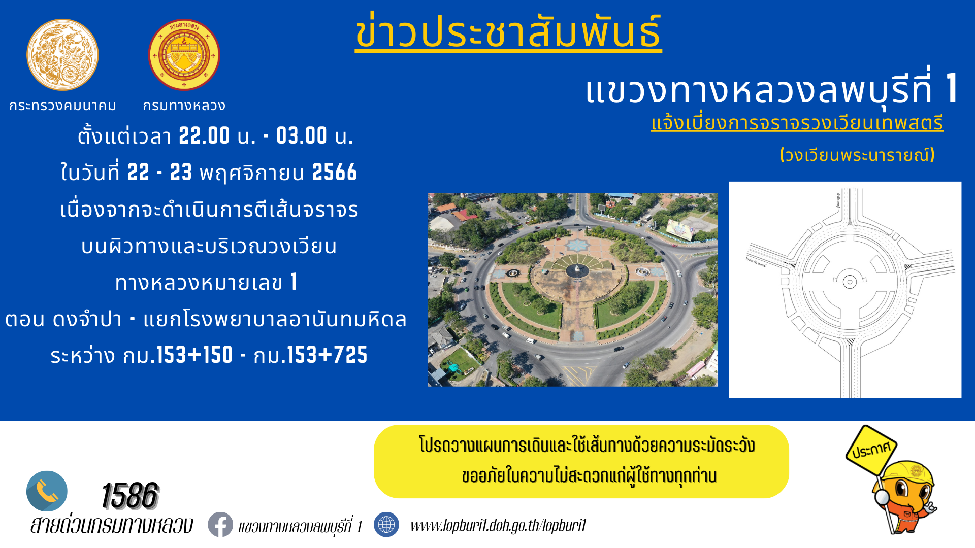 ข่าวประชาสัมพันธ์ แจ้งเบี่ยงการจราจรบริเวณวงเวียนเทพสตรี (วงเวียนพระนารายณ์)