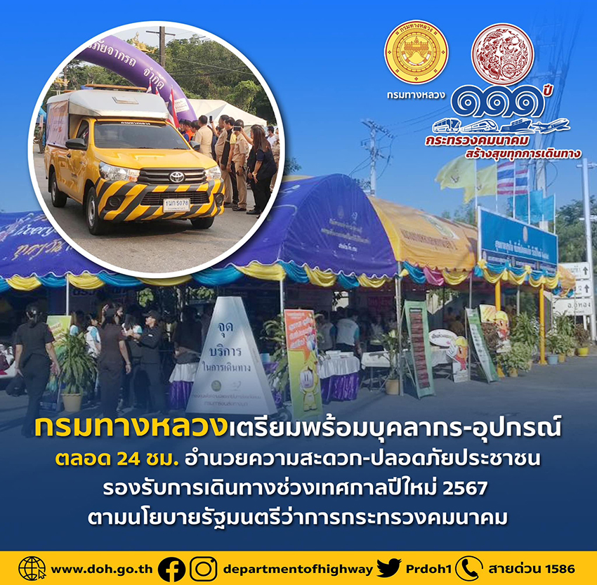 กรมทางหลวง เตรียมพร้อมบุคลากร-อุปกรณ์ตลอด 24 ชม. อำนวยความสะดวก-ปลอดภัยประชาชน รองรับการเดินทางช่วงเทศกาลปีใหม่ 2567 ตามนโยบายรัฐมนตรีว่าการกระทรวงคมนาคม