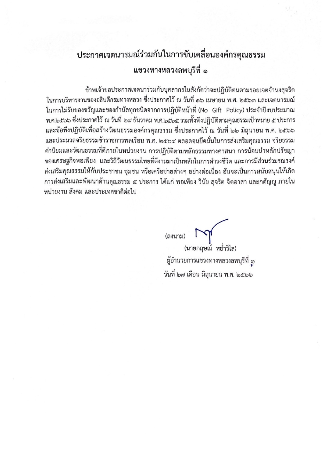 270 30/06/2566 ประกาศเจตนารมย์ร่วมกันในการขับเคลื่อนองค์กรคุณธรรม