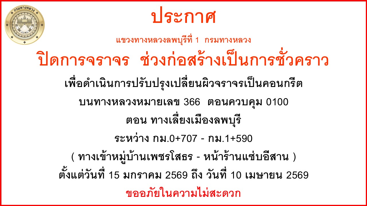 แขวงทางหลวงลพบุรีที่ 1 ขอประชาสัมพันธ์ การปิดช่องจราจรและใช้ทางเบี่ยง งานปรับปรุงผิวจราจรทางหลวงหมายเลข 366 ตอนทางเลี่ยงเมืองลพบุรี