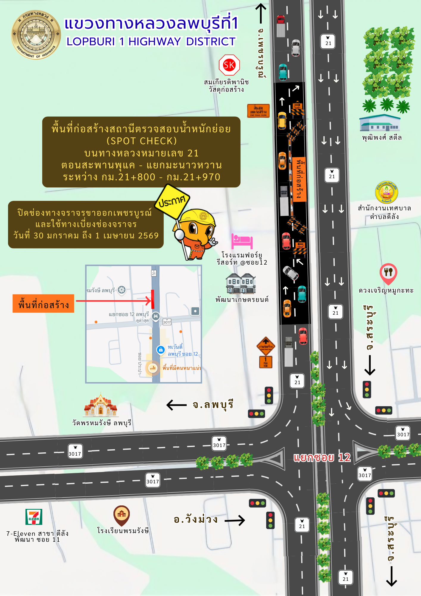 แขวงทางหลวงลพบุรีที่ 1 ขอประชาสัมพันธ์ ปิดการจราจร ช่วงก่อสร้างเป็นการชั่วคราว เพื่อดำเนินการก่อสร้างสถานีตรวจสอบน้ำหนักย่อย (SPOT CHECK) ทางหลวงหมายเลข 21 ตอนสะพานพุแค - แยกมะนาวหวาน ระหว่าง กม.21+800 - กม.21+970 ด้านซ้ายทาง ตั้งแต่วันที่ 1 มีนาคม - วันที่ 27 มีนาคม 2569 ตลอด 24 ชั่วโมง ขออภัยในความไม่สะดวก
