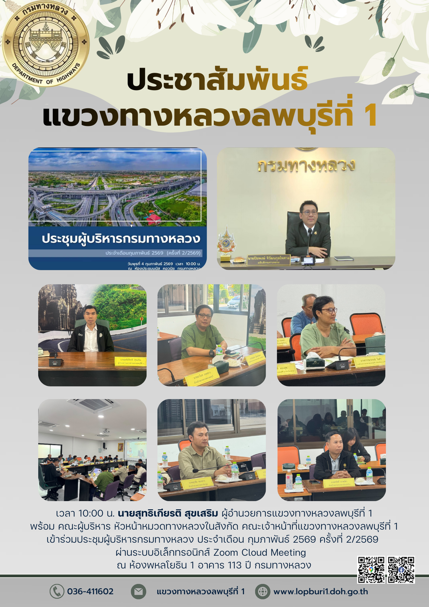 นายสุทธิเกียรติ สุขเสริม ผู้อำนวยการแขวงทางหลวงลพบุรีที่ 1 พร้อม คณะผู้บริหาร หัวหน้าหมวดทางหลวงในสังกัด คณะเจ้าหน้าที่แขวงทางหลวงลพบุรีที่ 1 เข้าร่วมประชุมผู้บริหารกรมทางหลวง ประจำเดือน กุมภาพันธ์ 2569 ครั้งที่ 2/2569 ผ่านระบบอิเล็กทรอนิกส์ Zoom Cloud Meeting