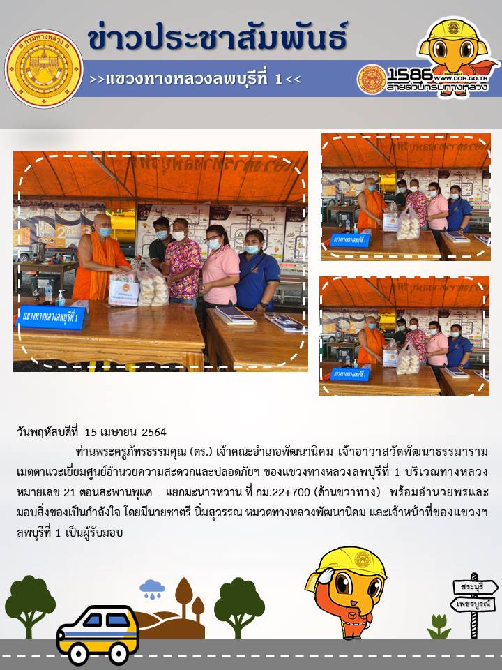 ท่านพระครูภัทรธรรมคุณ (ดร.) เจ้าคณะอำเภอพัฒนานิคม เจ้าอาวาสวัดพัฒนาธรรมาราม เมตตาแวะเยี่ยมศูนย์อำนวยความสะดวกและปลอดภัยฯ ของแขวงทางหลวงลพบุรีที่ 1