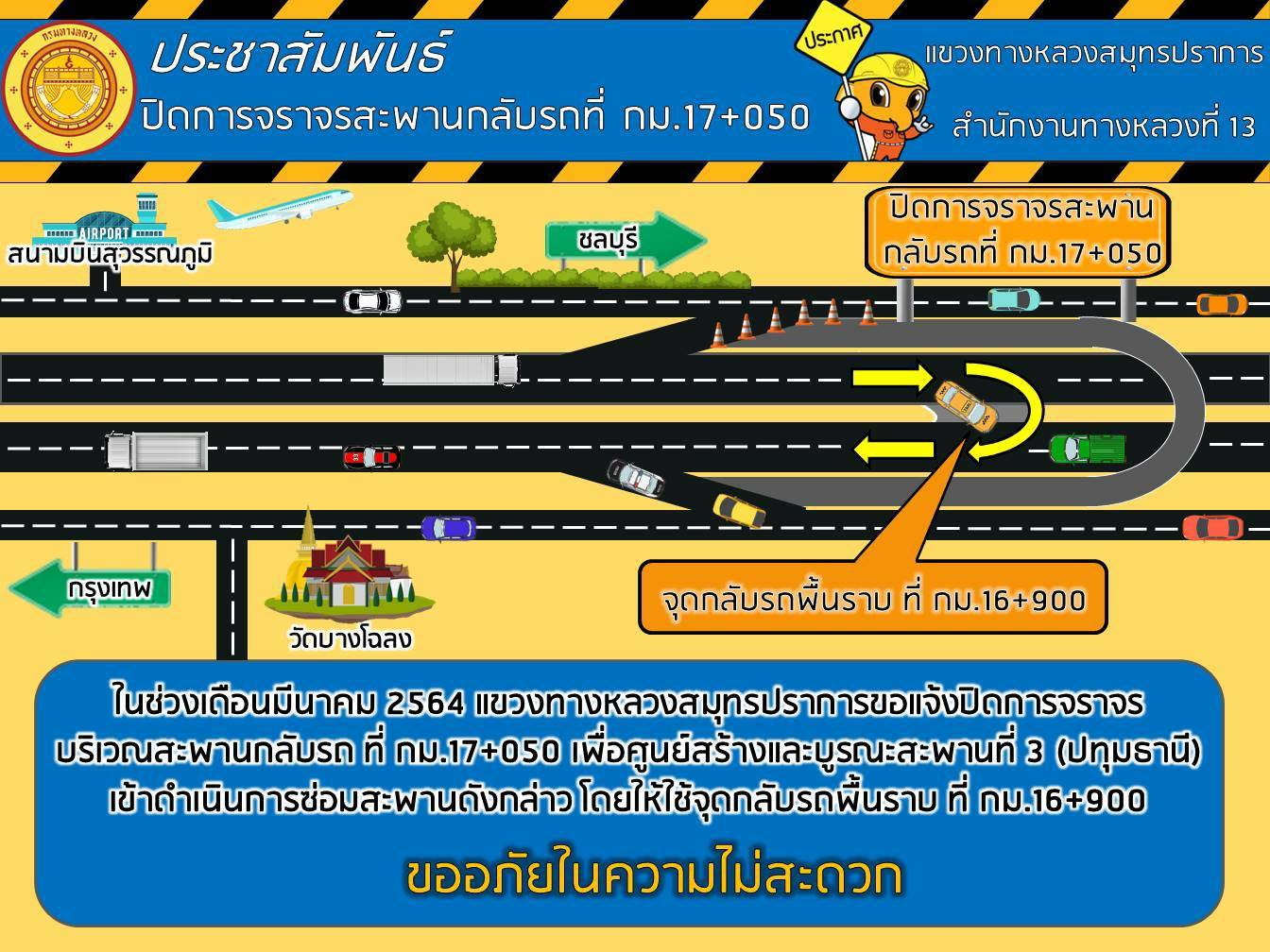 กรมทางหลวง แจ้งเบี่ยงการจราจรทางหลวงหมายเลข 34 (ถนนนพรัตน) ที่ กม.17+050 เพื่อซ่อมสะพานลอยกลับรถ ตั้งแต่บัดนี้ เป็นต้นไป