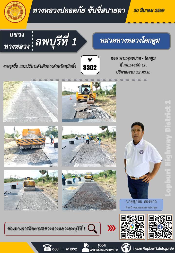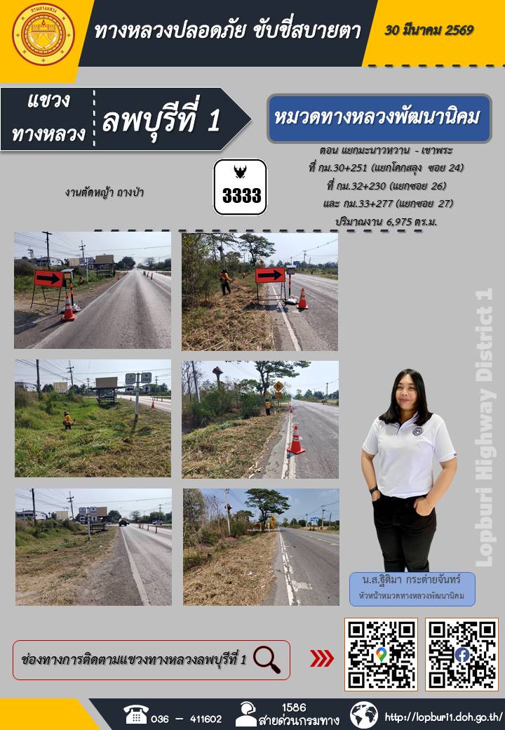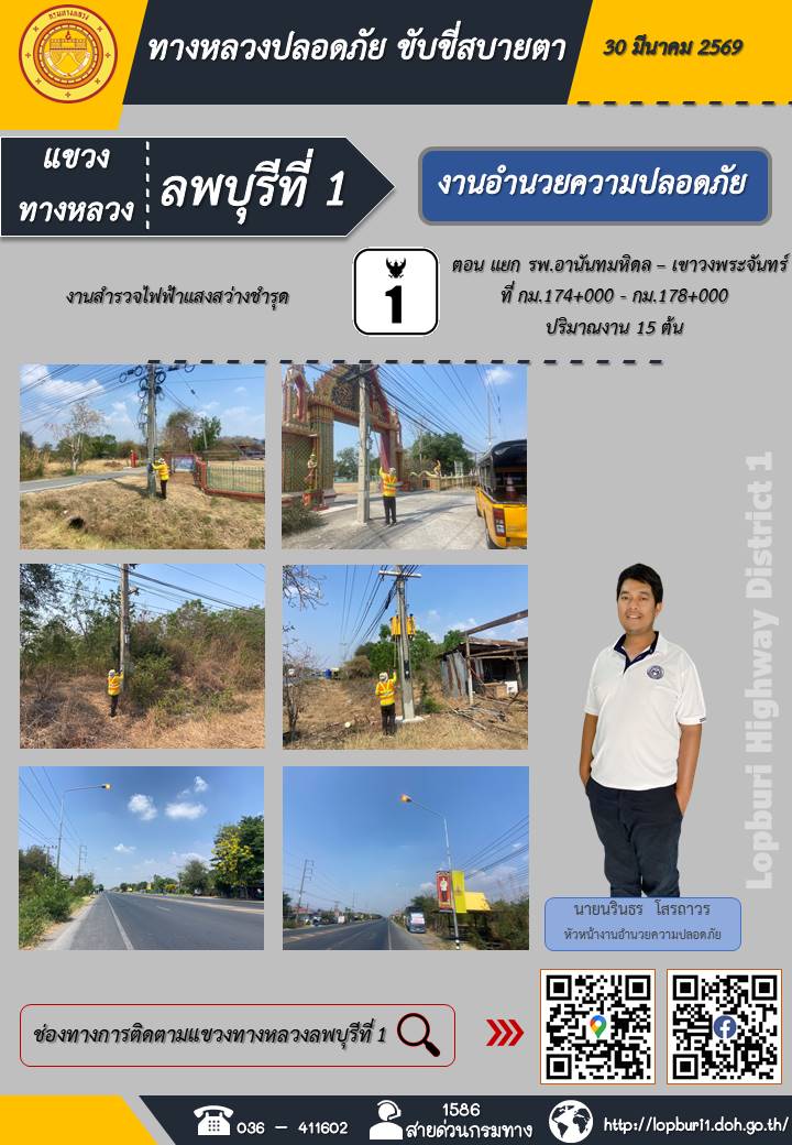 ทางหลวงปลอดภัยขับขี่สบายตา แขวงทางหลวงลพบุรีที่ 1 ประจำวันที่ 30 มีนาคม 2569