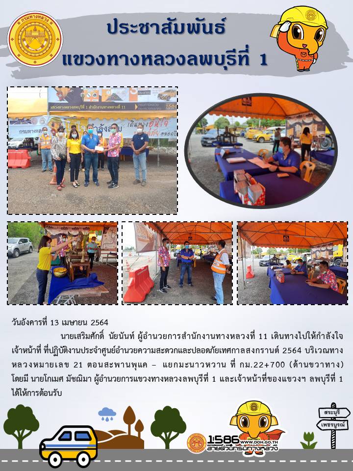 นายเสริมศักดิ์ นัยนันท์ ผู้อำนวยการสำนักงานทางหลวงที่ 11 เดินทางไปให้กำลังใจเจ้าหน้าที่ ที่ปฏิบัติงานประจำศูนย์อำนวยความสะดวกและปลอดภัยเทศกาลสงกรานต์ 2564 บริเวณทางหลวงหมายเลข 21 ตอนสะพานพุแค – แยกมะนาวหวาน ที่ กม.22+700 (ด้านขวาทาง) โดยมี นายโกเมศ มัชฌิมา ผู้อำนวยการแขวงทางหลวงลพบุรีที่ 1 และเจ้าหน้าที่ของแขวงฯ ลพบุรีที่ 1 ได้ให้การต้อนรับ