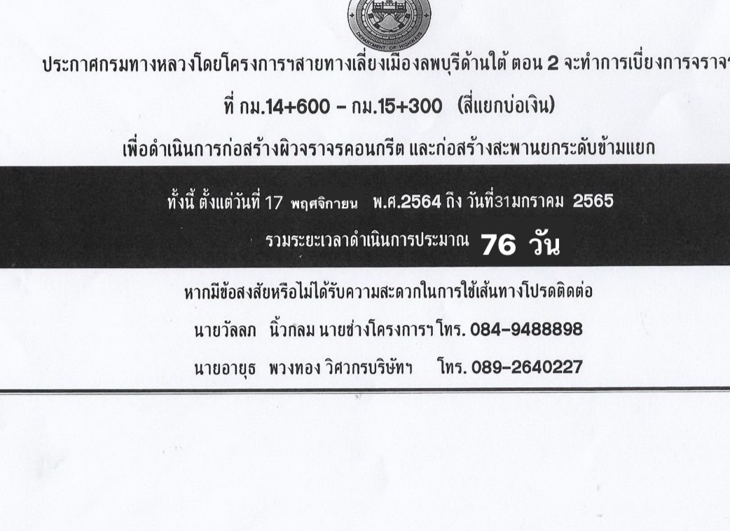 โดยจะทำการเบี่ยงจราจรระหว่างก่อสร้างในการสัญจรผ่านพื้นที่ก่อสร้างเพื่อความสะดวกต่อผู้ใช้เส้นทาง โปรดวางแผนการใช้เส้นทางและหลีกเลี่ยงเส้นทางดังกล่าว ขออภัยในความไม่สะดวก