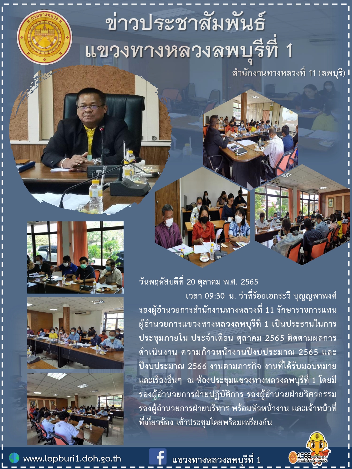 เวลา 09:30 น. ว่าที่ร้อยเอกระวี บุญญพาพงศ์ รองผู้อำนวยการสำนักงานทางหลวงที่ 11 รักษาราชการแทน ผู้อำนวยการแขวงทางหลวงลพบุรีที่ 1 เป็นประธานในการประชุมภายใน ประจำเดือน ตุลาคม 2565 ติดตามผลการดำเนินงาน ความก้าวหน้างานปีงบประมาณ 2565 และปีงบประมาณ 2566 งานตามภารกิจ งานที่ได้รับมอบหมายและเรื่องอื่นๆ ณ ห้องประชุมแขวงทางหลวงลพบุรีที่ 1 โดยมี รองผู้อำนวยการฝ่ายปฏิบัติการ รองผู้อำนวยฝ่ายวิศวกรรม รองผู้อำนวยการฝ่ายบริหาร พร้อมหัวหน้างาน และเจ้าหน้าที่ ที่เกี่ยวข้อง เข้าประชุมโดยพร้อมเพรียงกัน
