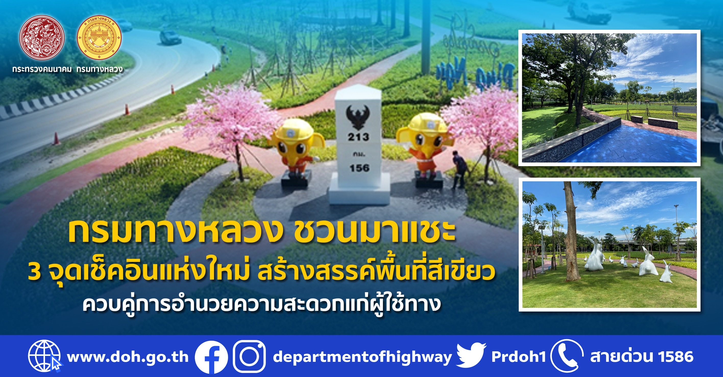 การดำเนินการปรับปรุงภูมิทัศน์ของกรมทางหลวงจะช่วยปรับปรุงให้มีความสวยงามและปลอดภัย เพิ่มพื้นที่สีเขียวเพื่อเป็นพื้นที่จุดพักรถและกลายเป็นแหล่งท่องเที่ยวแห่งใหม่ให้ผู้ใช้ทางรวมถึงประชาชนที่อยู่ในพื้นที่ใกล้เคียงได้เข้ามาพักผ่อน เพื่อช่วยลดอุบัติเหตุที่อาจเกิดระหว่างการเดินทาง ตลอดจนเป็นการอนุรักษ์ธรรมชาติ ลดภาวะโลกร้อนและฝุ่นละออง ทั้งนี้ขอให้ประชาชนผู้ใช้ทางโปรดใช้ความระมัดระวังในการใช้เส้นทาง เพื่อความสะดวกและปลอดภัยของผู้ใช้ทาง หากต้องการสอบถามสภาพเส้นทาง สภาพการจราจรหรือขอความช่วยเหลือต่างๆ สามารถติดต่อได้ที่สายด่วนกรมทางหลวง 1586 (โทรฟรีทุกเครือข่ายตลอด 24 ชั่วโมง)