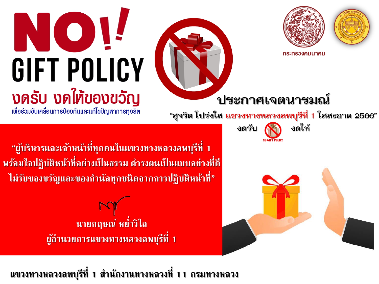 No Gift Policy ประกาศเจตนารมณ์ “สุจริต โปร่งใส แขวงทางหลวงลพบุรีที่ 1 ใสสะอาด 2566” งดรับ งดให้