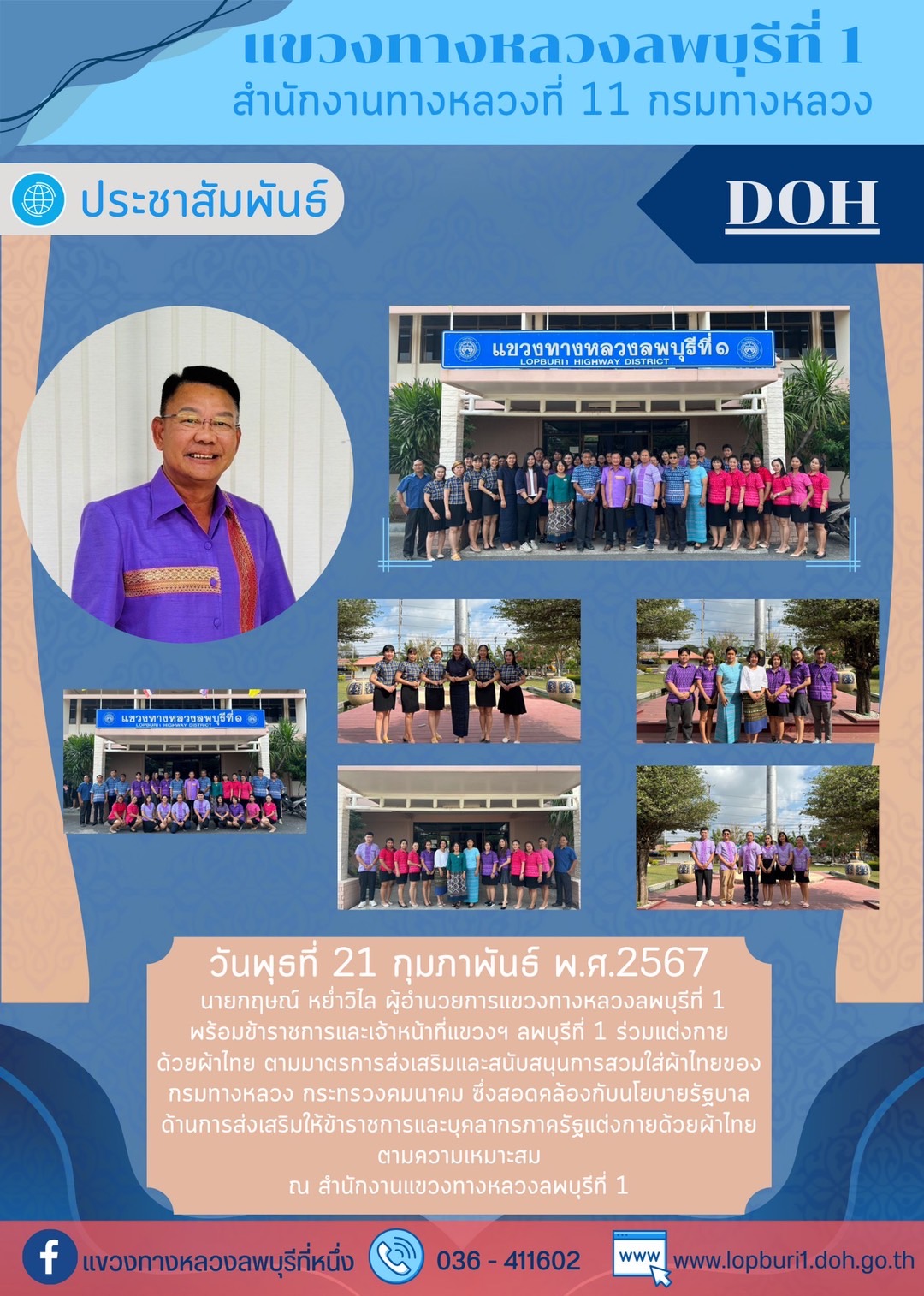 นายกฤษณ์ หย่ำวิไล ผู้อำนวยการแขวงทางหลวงลพบุรีที่ 1 พร้อมข้าราชการและเจ้าหน้าที่แขวงฯ ลพบุรีที่ 1 ร่วมแต่งกายด้วยผ้าไทย ตามมาตรการส่งเสริมและสนับสนุนการสวมใส่ผ้าไทยของกรมทางหลวง กระทรวงคมนาคม ซึ่งสอดคล้องกับนโยบายรัฐบาล ด้านการส่งเสริมให้ข้าราชการและบุคลากรถาครัฐแต่งกายด้วยผ้าไทยตามความเหมาะสม