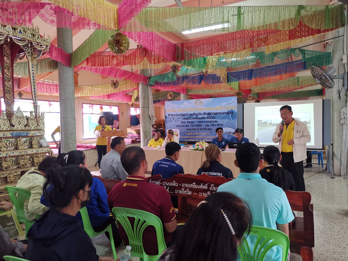 นายกฤษณ์ หย่ำวิไล ผู้อำนวยการแขวงทางหลวงลพบุรีที่ 1 พร้อมด้วยเจ้าหน้าที่แขวงทางหลวงลพบุรีที่ 1 จัดการประชุมรับฟังการบรรยายพร้อมแสดงความคิดเห็น และร่วมแลกเปลี่ยนข้อมูล โครงการก่อสร้างเพิ่มประสิทธิภาพทางหลวง ทางหลวงหมายเลข 3333 ตอน โคกตูม - แยกมะนาวหวาน ระหว่าง กม.15+680 – กม.18+350 โดยมีนายสุทธิเกียรติ สุขเสริม ผู้อำนวยการส่วนควบคุมงานก่อสร้าง สำนักงานทางหลวงที่ 11 และนายสามารถ ลัดดาแย้ม นายช่างสำรวจอาวุโส สำนักงานทางหลวงที่ 11 เป็นวิทยากรให้คำแนะนำแก่ตัวแทนหน่วยงานราชการที่เกี่ยวข้อง และประชาชนที่อาศัยอยู่ในบริเวณสองข้างทาง ณ ศาลาอเนกประสงค์วัดโคกตูม ตำบลดีลัง อำเภอพัฒนานิคม จังหวัดลพบุรี