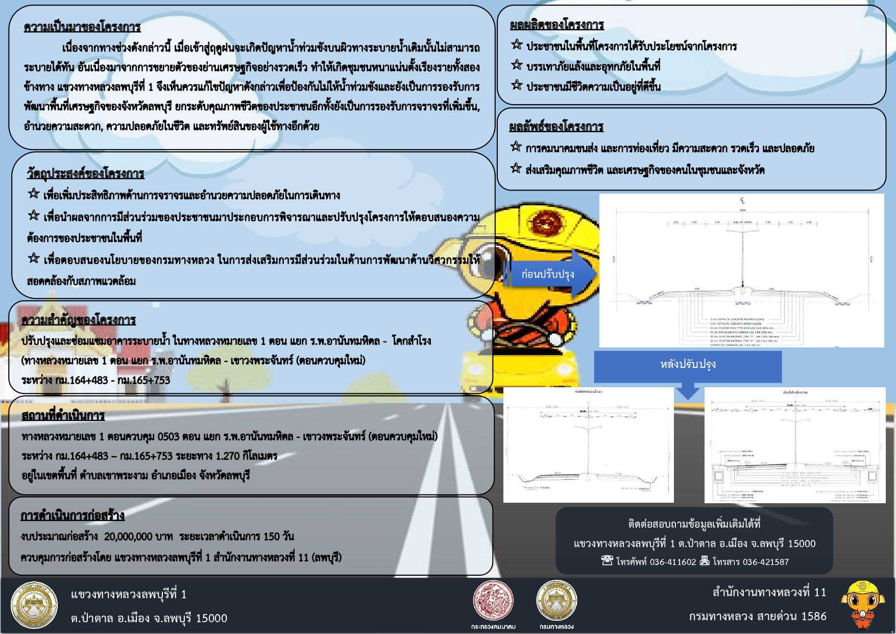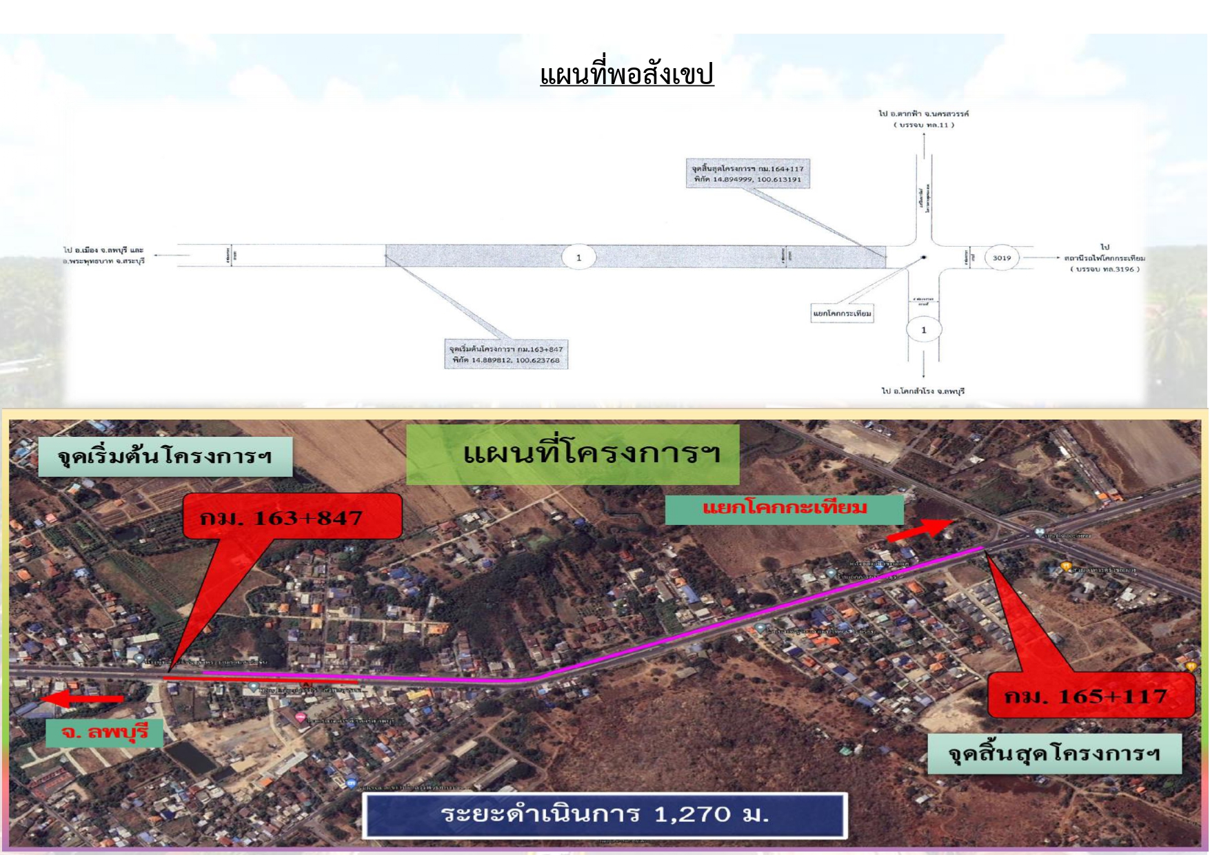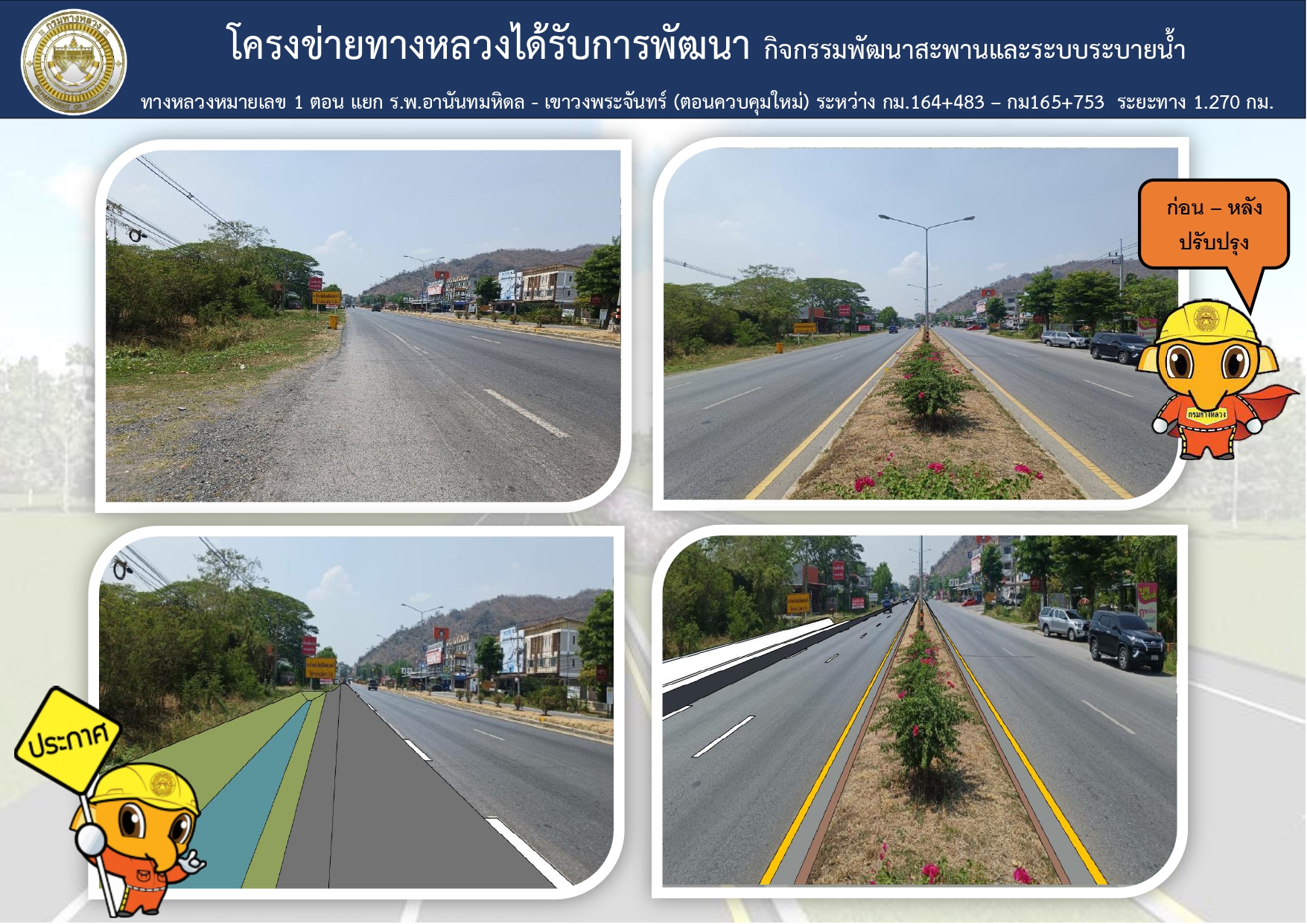 ด้วยแขวงทางหลวงลพบุรีที่ 1 กรมทางหลวง ได้รับจัดสรรงบประมาณปี 2567 ก่อสร้างกิจกรรมพัฒนาสะพานและระบบระบายน้ำ ทางหลวงหมายเลข 1 ตอน แยก ร.พ.อานันทมหิดล - โคกสำโรง (ตอน แยก ร.พ.อานันทมหิดล - เขาวงพระจันทร์ (ตอนควบคุมใหม่) ระหว่าง กม.164+483 - กม.165+753 ปริมาณงาน 1 แห่ง