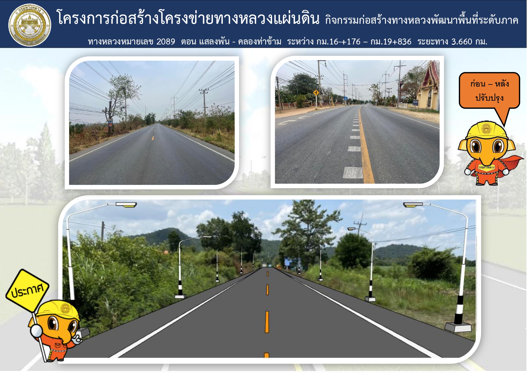 ด้วยแขวงทางหลวงลพบุรีที่ 1 กรมทางหลวง ได้รับจัดสรรงบประมาณปี 2567 โครงการก่อสร้างโครงข่ายทางหลวงแผ่นดินกิจกรรมก่อสร้างทางหลวงพัฒนาพื้นที่ระดับภาค ทางหลวงหมายเลข 2089 ตอน ตอน แสลงพัน – คลองท่าข้าม ระหว่าง กม.16+176 – กม.19+836