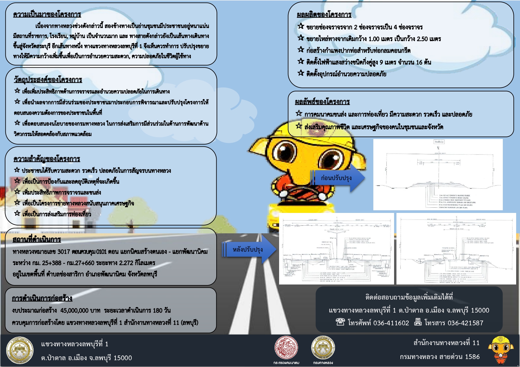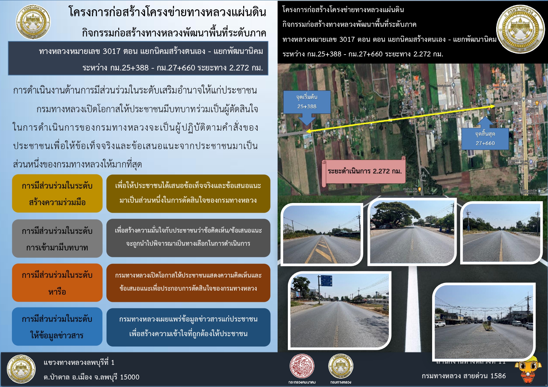 ด้วยแขวงทางหลวงลพบุรีที่ 1 กรมทางหลวง ได้รับจัดสรรงบประมาณปี 2567 โครงการก่อสร้างโครงข่ายทางหลวงแผ่นดิน กิจกรรมก่อสร้างทางหลวงพัฒนาพื้นที่ระดับภาค ทางหลวงหมายเลข 3017 ตอน ตอน แยกนิคมสร้างตนเอง - แยกพัฒนานิคมระหว่าง กม.25+388 - กม.27+660