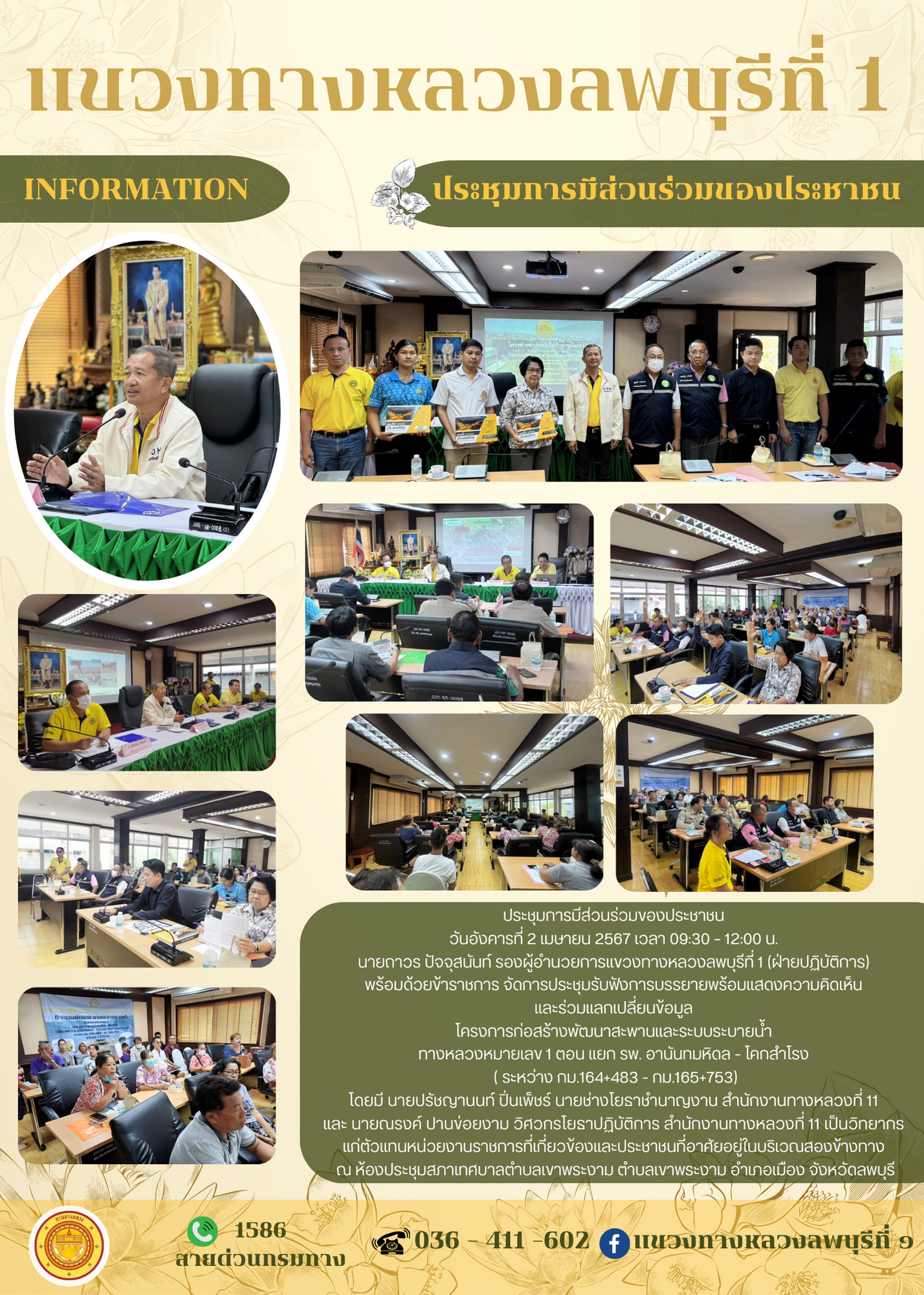 ประชุมการมีส่วนร่วมของประชาชน วันอังคารที่ 2 เมษายน 2567 เวลา 09:30 – 12:00 น. นายถาวร ปัจจุสนันท์ รองผู้อำนวยการแขวงทางหลวงลพบุรีที่ 1 (ฝ่ายปฏิบัติการ) พร้อมด้วยข้าราชการ จัดการประชุมรับฟังการบรรยายพร้อมแสดงความคิดเห็น และร่วมแลกเปลี่ยนข้อมูล โครงการก่อสร้างพัฒนาสะพานและระบบระบายน้ำ ทางหลวงหมายเลข 1 ตอน แยก รพ. อานันทมหิดล - โคกสำโรง ( ระหว่าง กม.164+483 - กม.165+753) โดยมี นายปรัชญานนท์ ปิ่นเพ็ชร์ นายช่างโยธาชำนาญงาน สำนักงานทางหลวงที่ 11 และ นายณรงค์ ปานข่อยงาม วิศวกรโยธาปฏิบัติการ สำนักงานทางหลวงที่ 11 เป็นวิทยากร แก่ตัวแทนหน่วยงานราชการที่เกี่ยวข้องและประชาชนที่อาศัยอยู่ในบริเวณสองข้างทาง