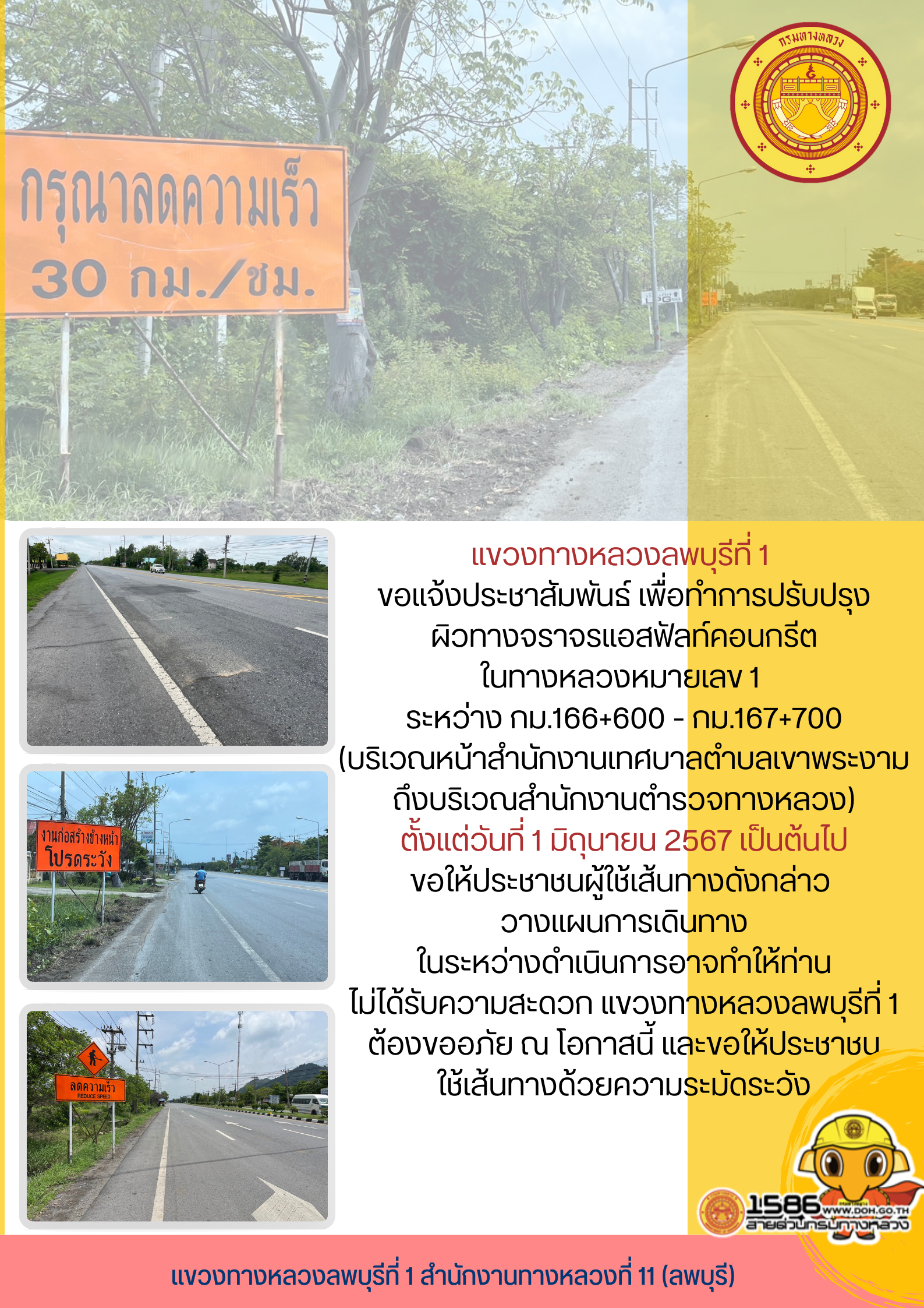 แขวงทางหลวงลพบุรีที่ 1 ขอแจ้งประชาสัมพันธ์ เพื่อทำการปรับปรุงผิวทางจราจรแอสฟัลท์คอนกรีต ในทางหลวงหมายเลข 1 ระหว่าง กม.166+600 - กม.167+700 (บริเวณหน้าสำนักงานเทศบาลตำบลเขาพระงาม ถึงบริเวณสำนักงานตำรวจทางหลวง) ตั้งแต่วันที่ 1 มิถุนายน 2567 เป็นต้นไป