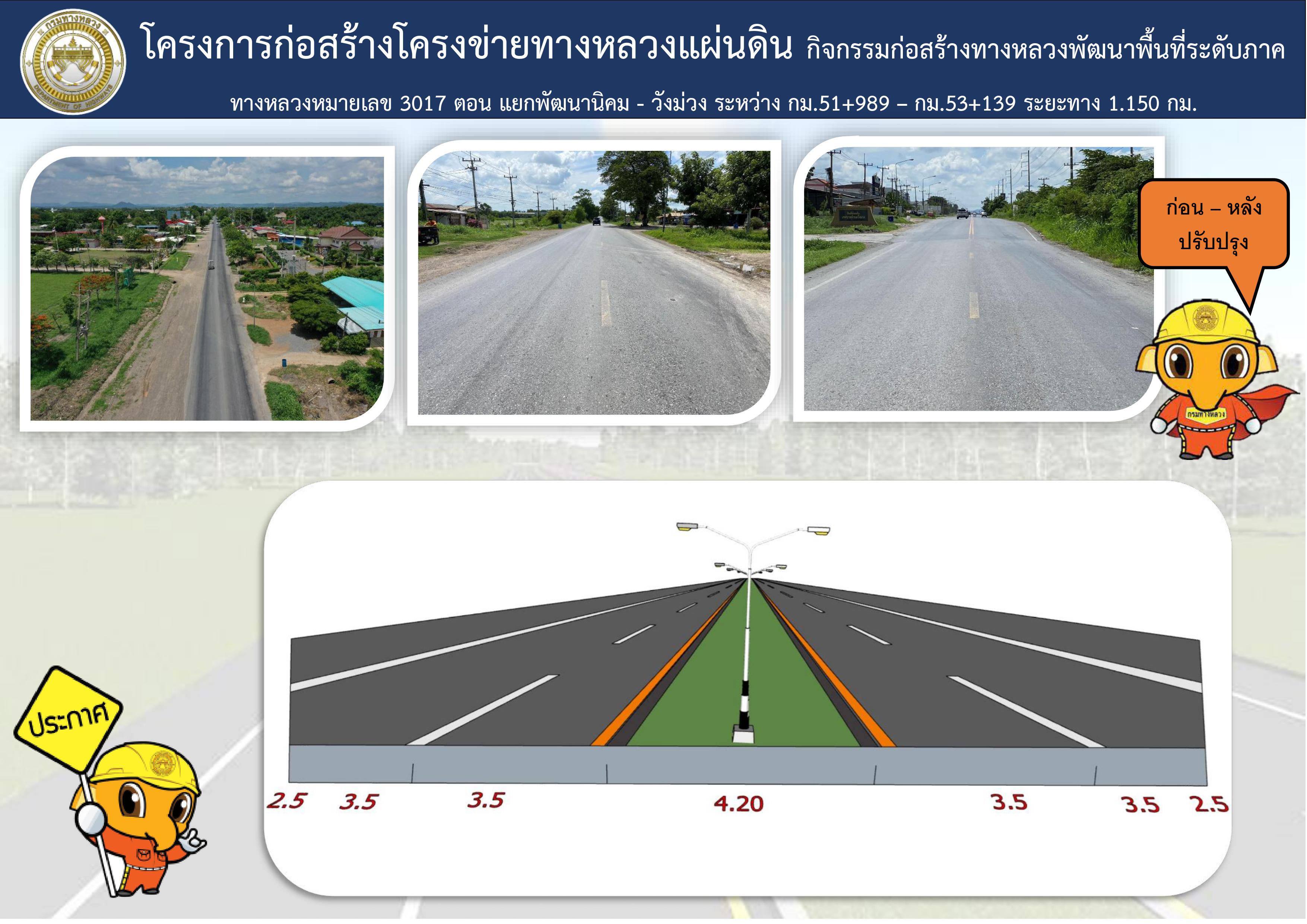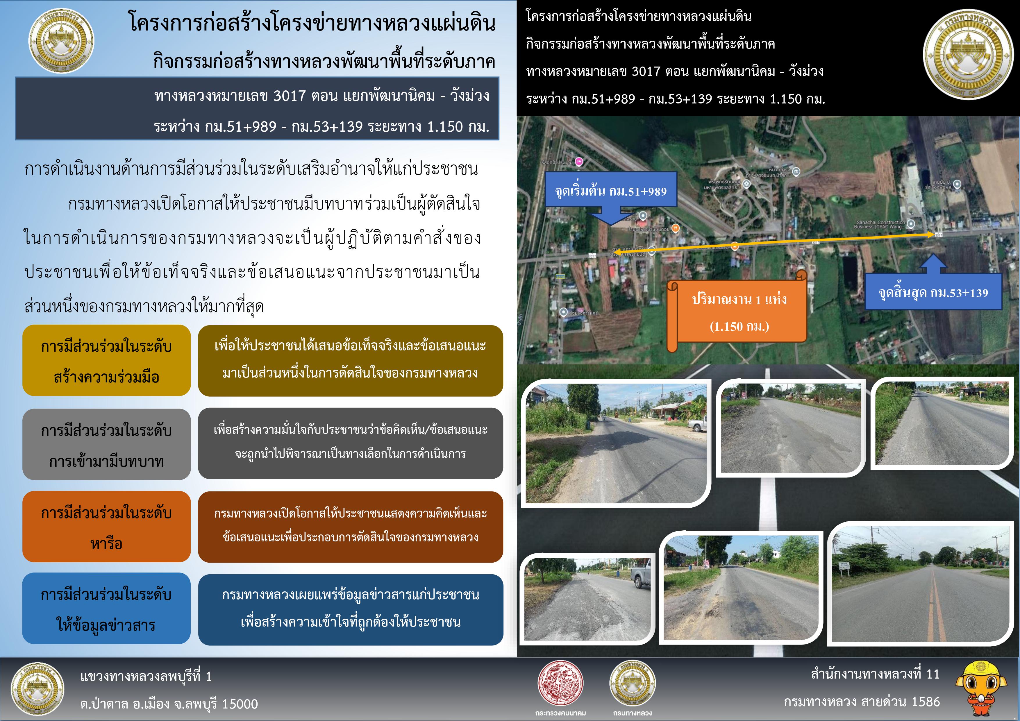 ด้วยแขวงทางหลวงลพบุรีที่ 1 กรมทางหลวง ได้รับจัดสรรงบประมาณปี 2568 โครงการก่อสร้างโครงข่ายทางหลวงแผ่นดิน กิจกรรมก่อสร้างทางหลวงพัฒนาพื้นที่ระดับภาค งานก่อสร้างเพิ่มมาตรฐานทางหลวงระดับภาค ทางหลวงหมายเลข 3017 ตอน แยกพัฒนานิคม - วังม่วง ระหว่าง กม.51+989 - กม.53+139 ปริมาณงาน 1 แห่ง โดยจะทำการขยายช่องจราจรจาก 2 ช่องจราจร เป็น 4 ช่องจราจรพร้อมขยายไหล่ทาง พร้อมติดตั้งไฟฟ้าแสงสว่าง/อุปกรณ์อำนวยความปลอดภัย เพื่อเพิ่มประสิทธิภาพในการรองรับประมาณจราจรที่เพิ่มมากขึ้น และเพื่ออำนวยความสะดวกปลอดภัยแก่ผู้ใช้ทางหลวงเพื่อให้ประชาชนในพื้นที่ และประชาชนทั่วไปผู้ใช้ทางหลวงได้รับทราบข้อมูลข่าวสาร รายละเอียดวัตถุประสงค์ และรูปแบบการก่อสร้างรวมถึงขั้นตอนการดำเนินงาน และเปิดโอกาสให้ทุกภาคส่วนที่เกี่ยวข้องได้เข้ามามีส่วนร่วมในการแลกเปลี่ยนข้อมูลข่าวสารที่เป็นประโยชน์ นำไปเป็นแนวทางพิจารณาประกอบการดำเนินงานในโครงการก่อสร้างให้เกิดความเหมาะสม และสอดคล้องกับความต้องการของพื้นที่จึงได้จัดให้มีการประชุมขึ้นในครั้งนี้