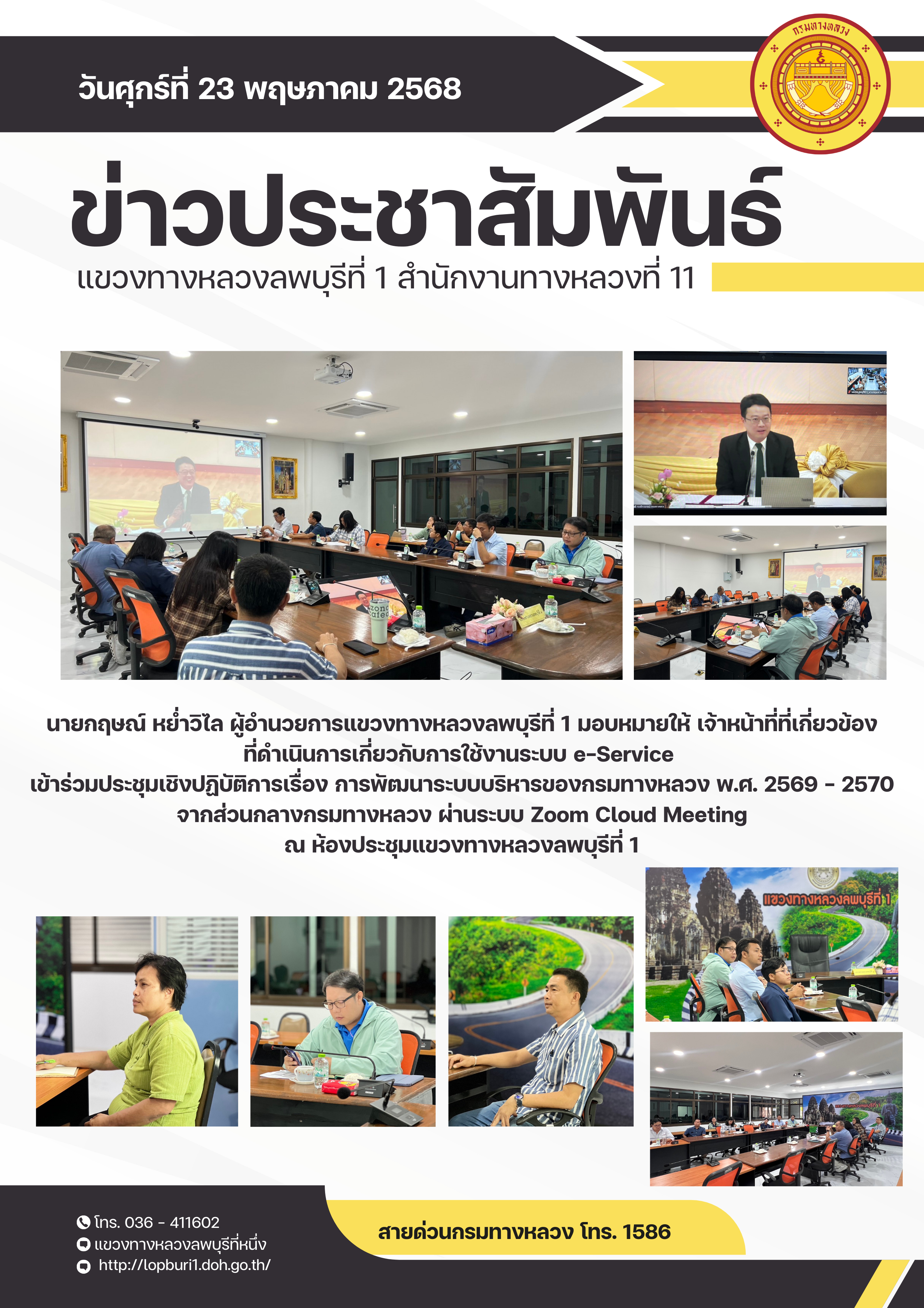 นายกฤษณ์ หย่ำวิไล ผู้อำนวยการแขวงทางหลวงลพบุรีที่ 1 มอบหมายให้ เจ้าหน้าที่ที่เกี่ยวข้อง ที่ดำเนินการเกี่ยวกับการใช้งานระบบ e-Service เข้าร่วมประชุมเชิงปฏิบัติการเรื่อง การพัฒนาระบบบริหารของกรมทางหลวง พ.ศ. 2569 - 2570 จากส่วนกลางกรมทางหลวง ผ่านระบบ Zoom Cloud Meeting ณ ห้องประชุมแขวงทางหลวงลพบุรีที่ 1