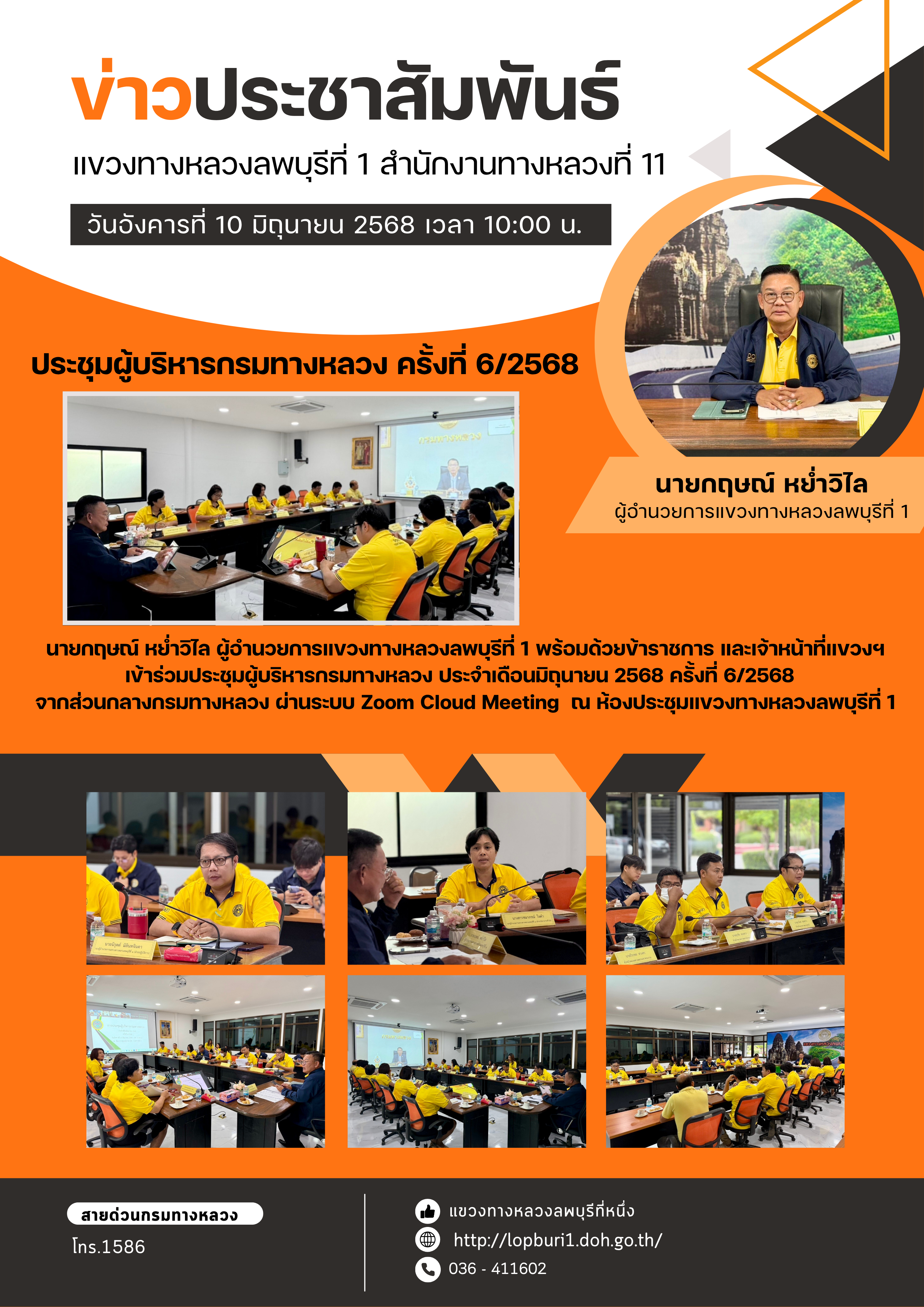 วันอังคารที่ 10 มิถุนายน 2568 เวลา 10:00 น. นายกฤษณ์ หย่ำวิไล ผู้อำนวยการแขวงทางหลวงลพบุรีที่ 1 พร้อมด้วยข้าราชการ และเจ้าหน้าที่แขวงฯ เข้าร่วมประชุมผู้บริหารกรมทางหลวง ประจำเดือนมิถุนายน 2568 ครั้งที่ 6/2568 จากส่วนกลางกรมทางหลวง ผ่านระบบ Zoom Cloud Meeting ณ ห้องประชุมแขวงทางหลวงลพบุรีที่ 1