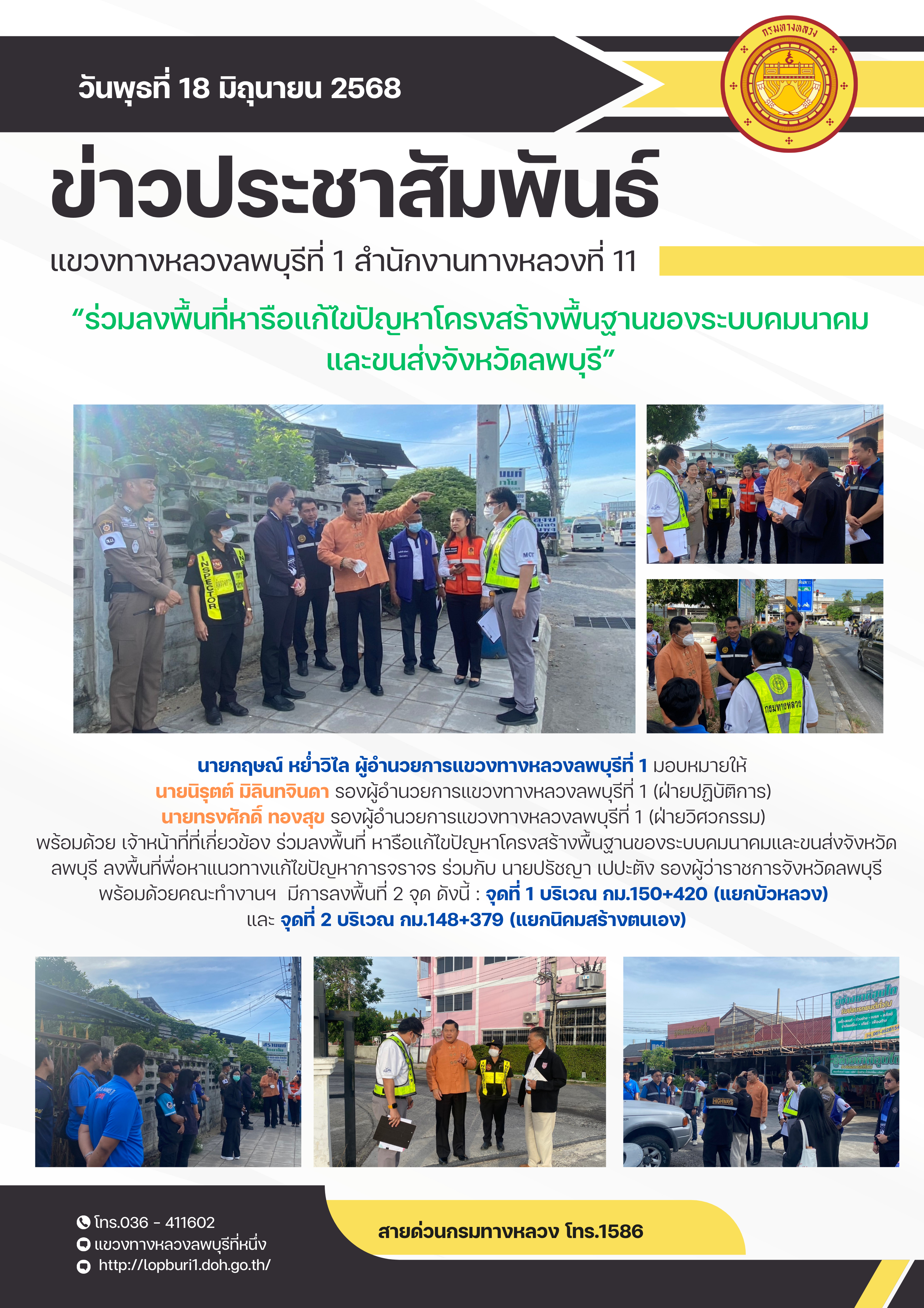 นายกฤษณ์ หย่ำวิไล ผู้อำนวยการแขวงทางหลวงลพบุรีที่ 1 มอบหมายให้ นายนิรุตต์ มิลินทจินดา รองผู้อำนวยการแขวงทางหลวงลพบุรีที่ 1 (ฝ่ายปฏิบัติการ) และ นายทรงศักดิ์ ทองสุข รองผู้อำนวยการแขวงทางหลวงลพบุรีที่ 1 (ฝ่ายวิศวกรรม) พร้อมด้วย เจ้าหน้าที่ที่เกี่ยวข้อง ร่วมลงพื้นที่ หารือแก้ไขปัญหาโครงสร้างพื้นฐานของระบบคมนาคมและขนส่งจังหวัดลพบุรี ลงพื้นที่พื่อหาแนวทางแก้ไขปัญหาการจราจร ร่วมกับ นายปรัชญา เปปะตัง รองผู้ว่าราชการจังหวัดลพบุรี พร้อมด้วยคณะทำงานฯ มีการลงพื้นที่ 2 จุด ดังนี้ : จุดที่ 1 บริเวณ กม.150+420 (แยกบัวหลวง) และ จุดที่ 2 บริเวณ กม.148+379 (แยกนิคมสร้างตนเอง)