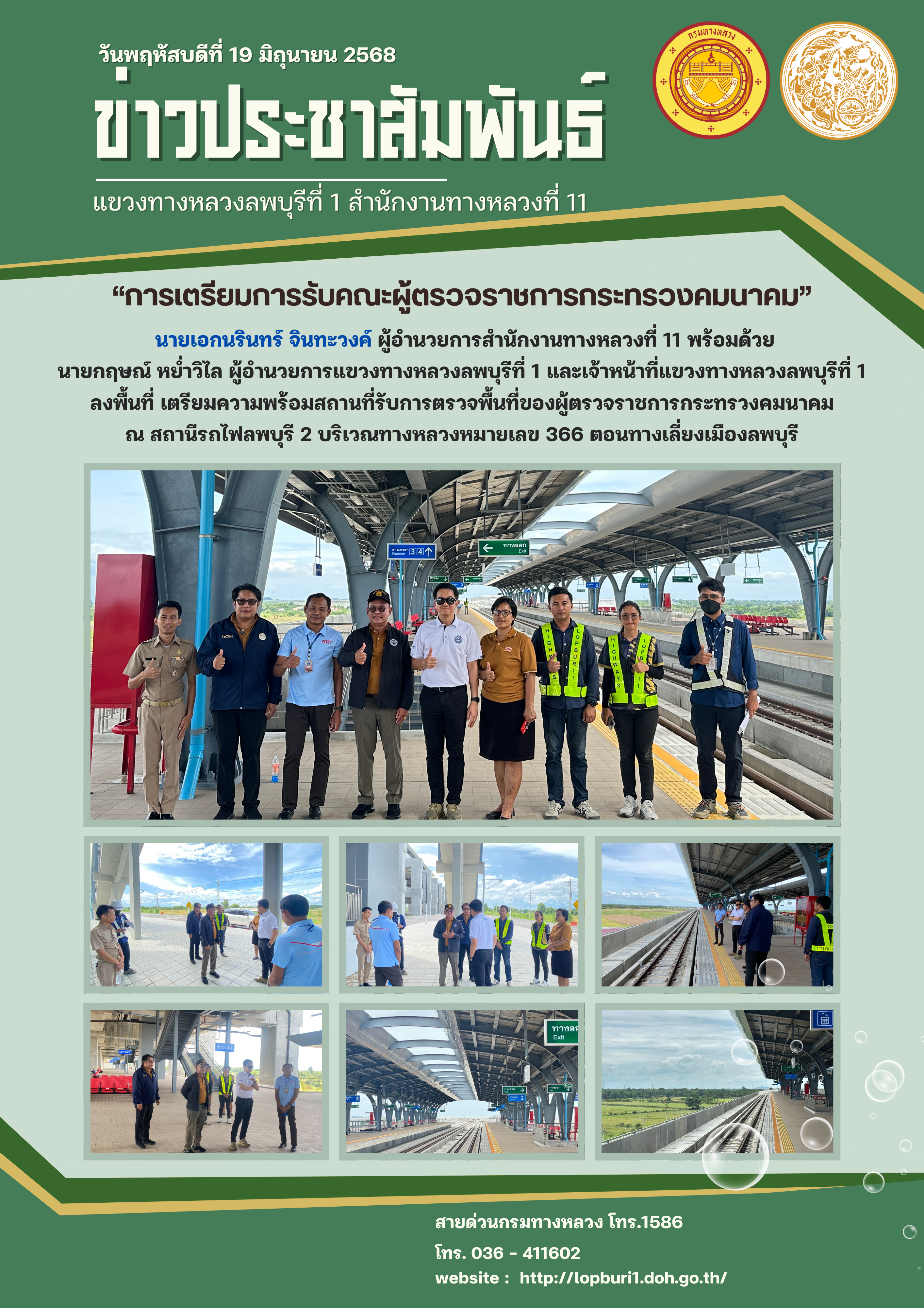 นายเอกนรินทร์ จินทะวงค์ ผู้อำนวยการสำนักงานทางหลวงที่ 11 พร้อมด้วย นายกฤษณ์ หย่ำวิไล ผู้อำนวยการแขวงทางหลวงลพบุรีที่ 1 และเจ้าหน้าที่แขวงทางหลวงลพบุรีที่ 1 ลงพื้นที่ เตรียมความพร้อมสถานที่รับการตรวจพื้นที่ของผู้ตรวจราชการกระทรวงคมนาคม ณ สถานีรถไฟลพบุรี 2 บริเวณทางหลวงหมายเลข 366 ตอนทางเลี่ยงเมืองลพบุรี
