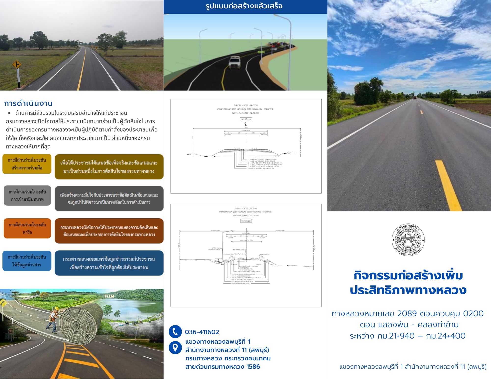 ด้วยแขวงทางหลวงลพบุรีที่ 1 กรมทางหลวง ได้รับจัดสรรงบประมาณปี 2568 กิจกรรมก่อสร้างเพิ่มประสิทธิภาพทางหลวง ทางหลวงหมายเลข 2089 ตอน แสลงพัน – คลองท่าข้าม ระหว่าง กม.21+940 – กม.24+400 ปริมาณงาน 1 แห่ง  โดยจะทำการขยายไหล่ทางจากเดิมกว้าง 1.50 เมตร เป็น กว้าง 2.50 เมตร พร้อมติดตั้งไฟฟ้าแสงสว่าง/อุปกรณ์อำนวยความปลอดภัย เพื่อเพิ่มประสิทธิภาพในการรองรับประมาณจราจรที่เพิ่มมากขึ้น และเพื่ออำนวยความสะดวกปลอดภัยแก่ผู้ใช้ทางหลวงเพื่อให้ประชาชนในพื้นที่ และประชาชนทั่วไปผู้ใช้ทางหลวงได้รับทราบข้อมูลข่าวสาร รายละเอียดวัตถุประสงค์ และรูปแบบการก่อสร้างรวมถึงขั้นตอนการดำเนินงาน และเปิดโอกาสให้ทุกภาคส่วนที่เกี่ยวข้องได้เข้ามามีส่วนร่วมในการแลกเปลี่ยนข้อมูลข่าวสารที่เป็นประโยชน์ นำไปเป็นแนวทางพิจารณาประกอบการดำเนินงานในโครงการก่อสร้างให้เกิดความเหมาะสม และสอดคล้องกับความต้องการของพื้นที่จึงได้จัดให้มีการประชุมขึ้นในครั้งนี้